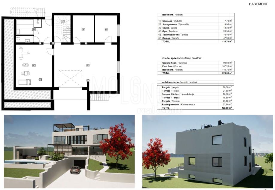 Podzemni prostor kuće donosi pravu wellness oazu s saunom i teretanom pored tehničke sobe, spremišta te prostrane garaže. Podrum ima 116,70 m².