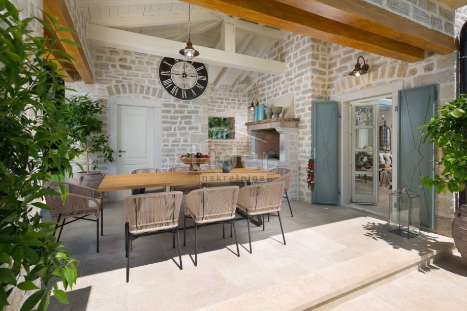 dnevni boravak sa vanjskim i unutarnjim kaminom te izlaskom na dvije natkrivene terase i bazen te jedno vanjsko kupatilo.