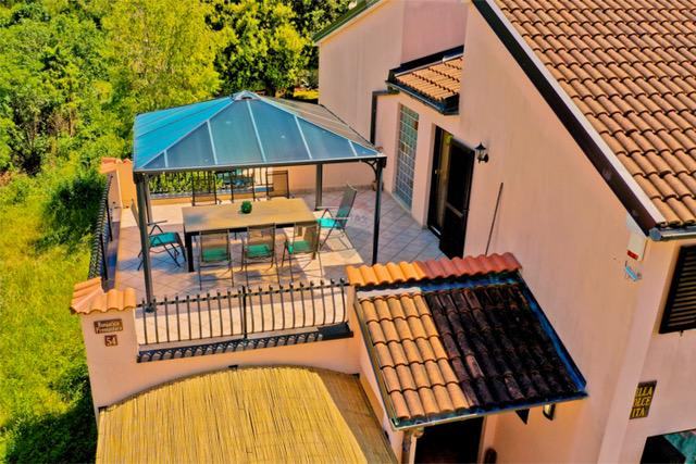 Kuća ima tri natkrivene lođe (na prvom katu i u prizemlju) natkrivenu terasu na prvom katu od 32 m2, jednu garažu i dva natkrivena parkirališta dužine 10 metara (30 m2 pri ulazu u kuću).