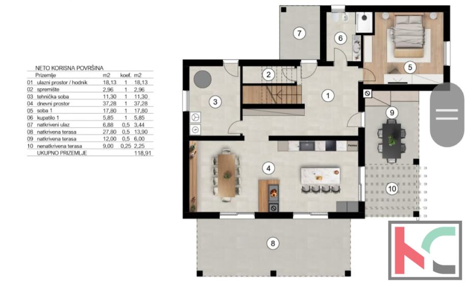 Prizemlje se sastoji od ulaznog hodnika, jedne spavaće sobe , kupaonice te open space prostora sa kuhinjom i blagovaonicom koja ima izlaz na natkrivenu terasu sa koje se može doći do bazena i sunčališta.