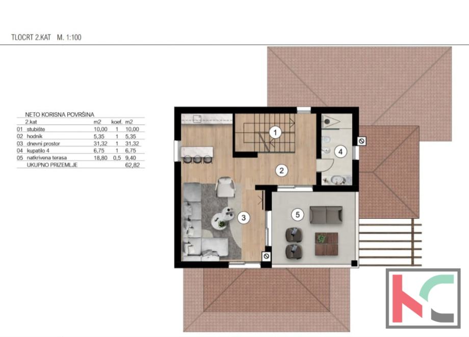 Zadnji kat sastoji se od kupatila, prostranog dnevnog prostora sa izlazom na natkrivenu terasu sa panoramskim pogledom.