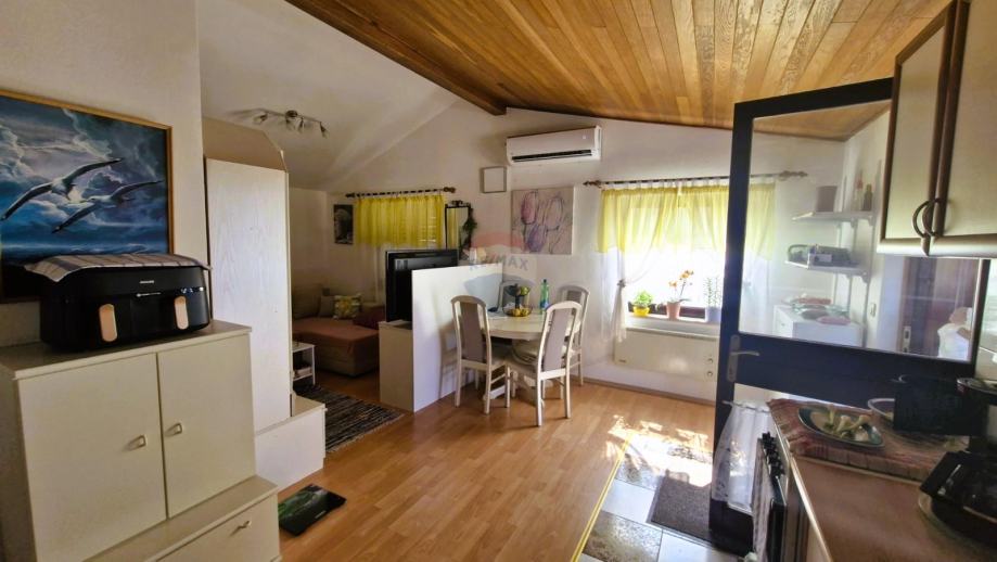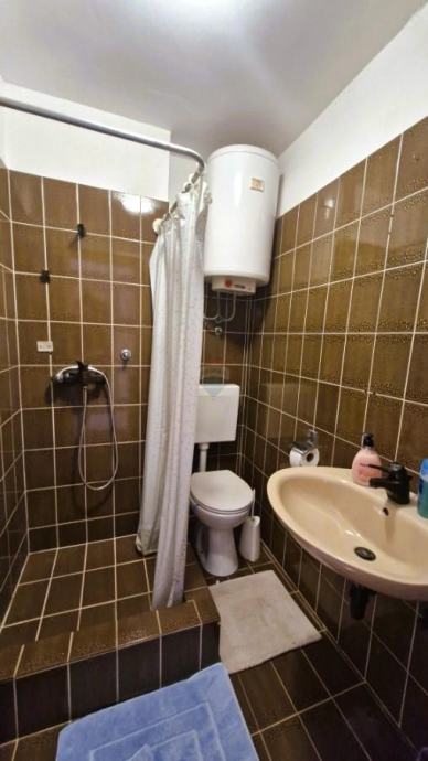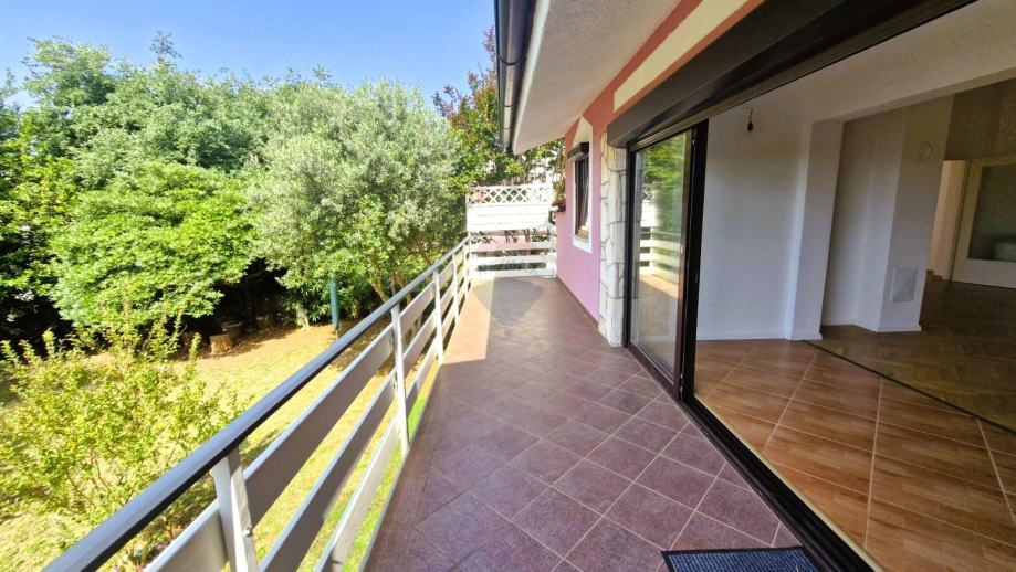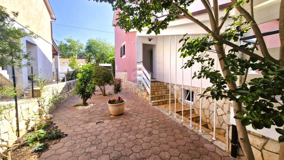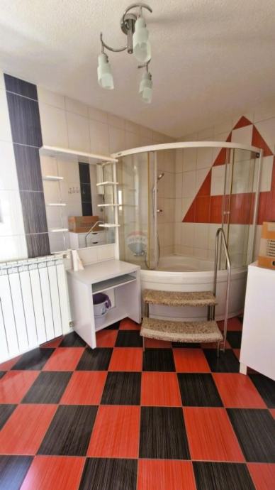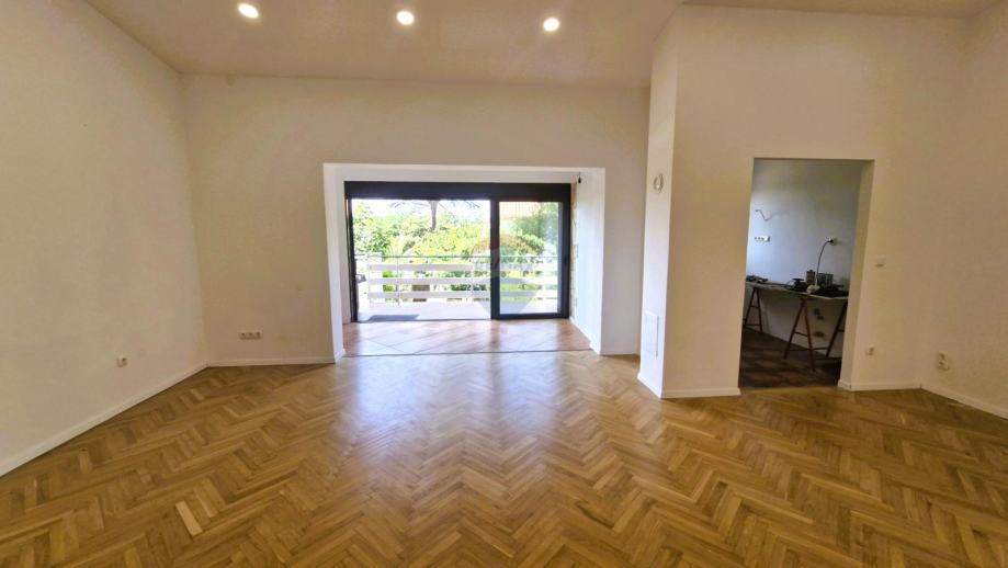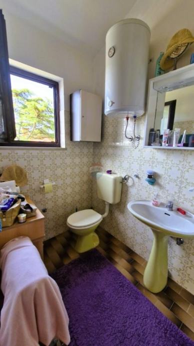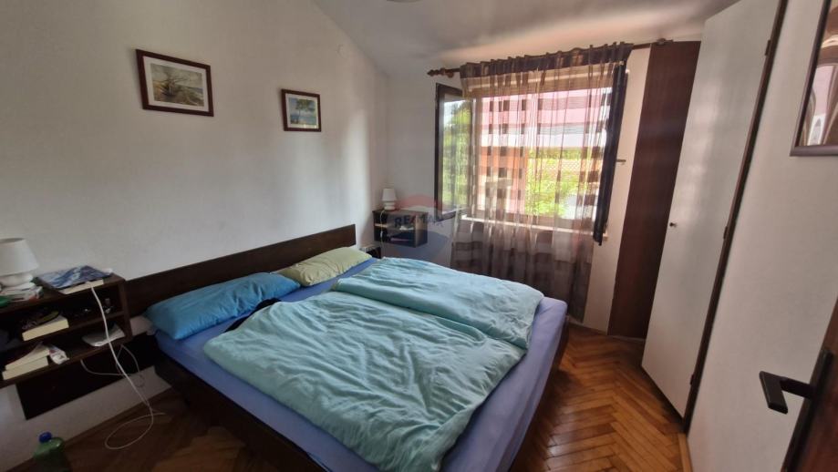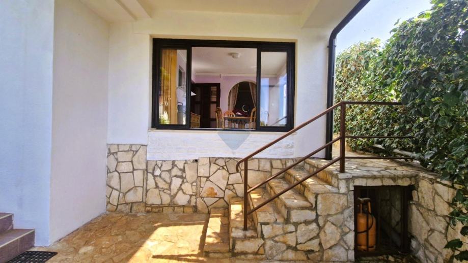 Visoko prizemlje u kojem je stan površine 80 m2 s direktnim izlazom na veliku terasu jugozapadne orijentacije, sastoji se od velikog dnevnog boravka 30 m2, blagovaone, kuhinje, dvije spavaće sobe, kupaone i hodnik sa stepeništem koji povezuje prvim katom na kojem se nalazi još jedna spavaća soba s balkonom i odvojenom kupaonom površine 34 m2 s druge strane kuće također u visokom prizemlju nalazi se još jedan manji stan od 32 m2 koji se sastoji od dvije spavaće sobe, kuhinje, blagovaone i kupaone.