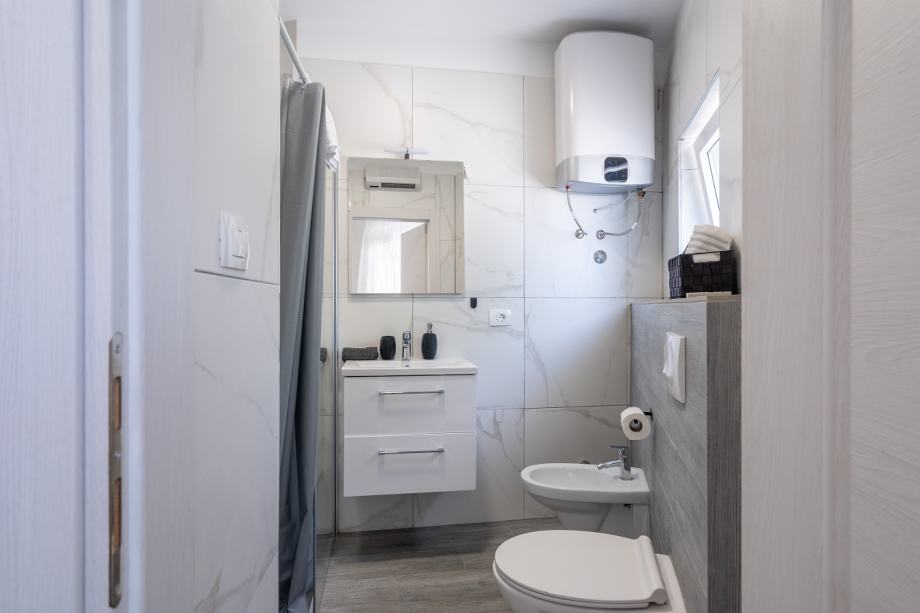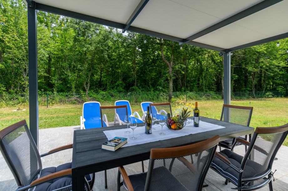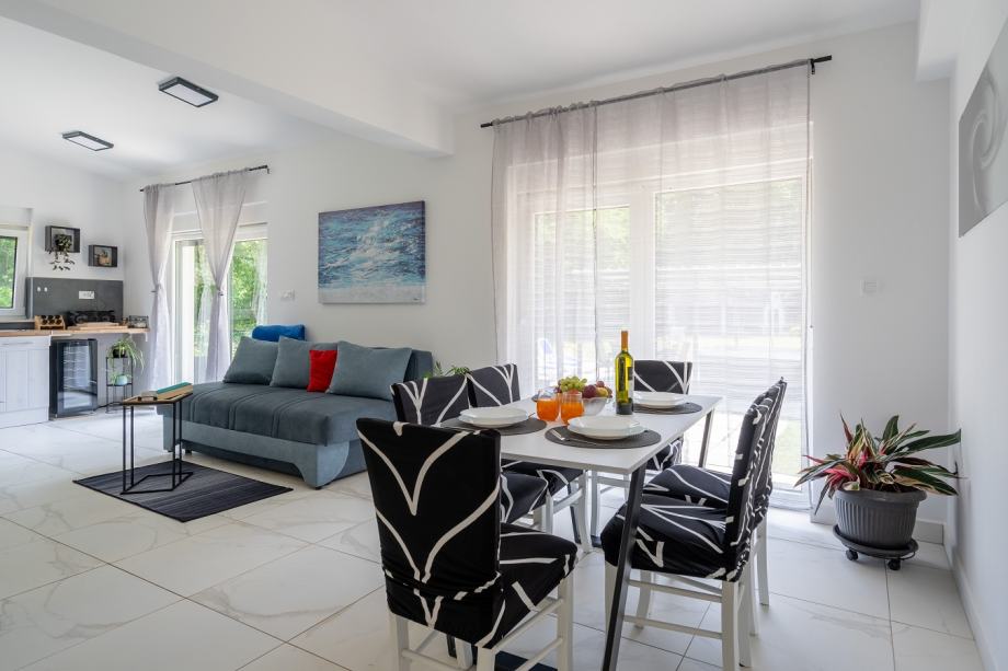 Prostrane 2 vanjske terase. Na prvoj terasi koja je natkrivena ima jacuzzi i ležaljke, vrtni stol i stolice za opuštanje u bilo koje doba dana ili noći. Druga terasa, također natkrivena drveni stol i klupe i pored terase roštilj. Najam je cijelu godinu.