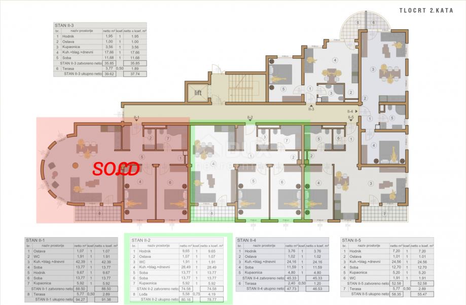 Tako u ovoj zgradi s ponosom predstavljamo stan na 2. katu koji se sastoji od ukupnih 78.77m2 NETO iskoristive površine.