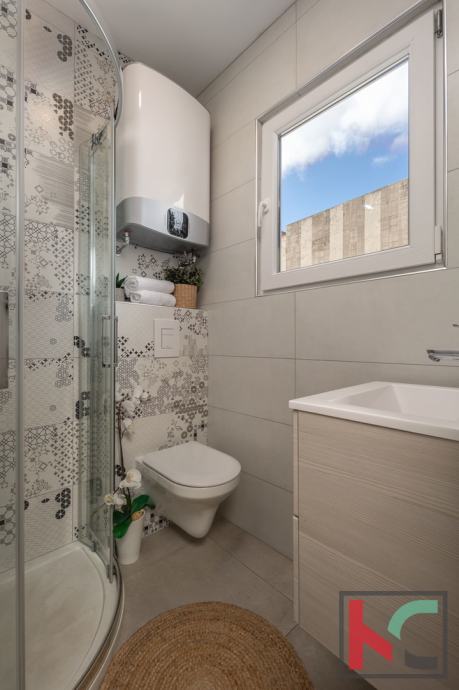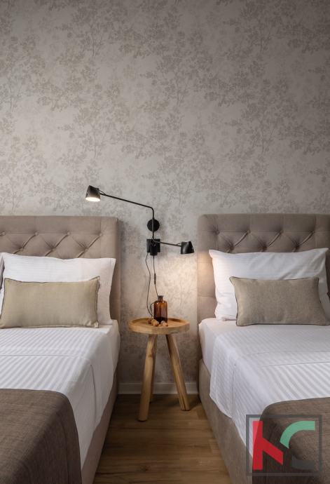 Opremljen je kvalitetnim namještajem izrađenim po mjeri, vrhunskim kućanskim aparatima, PVC stolarijom te je grijanje i hlađenje omogućeno putem klimatske jedinice.