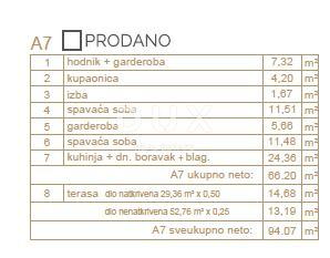Stan se sastoji od sveukupno 94,07 m2 stambenoga te reduciranog prostora, koji se smjestio u prizemlju fantastične stambene zgrade. Ulazom u stan dočekat će vas ulazni hodnik s garderoberom, koji vodi do prostranog dnevnog boravka s kuhinjom i blagovaonom. Stan ima dvije spavaće sobe, kupaonu te ostavu.