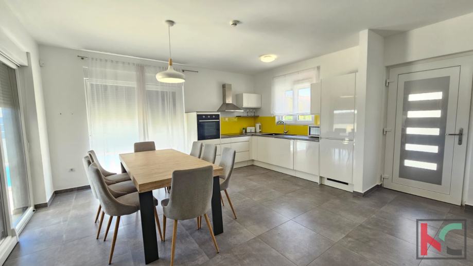 U prizemlju se nalazi moderna kuhinja opremljena aparatima, prilagođena svakodnevnim potrebama, dnevni boravak u komunikaciji sa natkrivenom terasom, toalet za goste. Na prvom katu smjestile su se tri spavaće sobe sa vlastitim kupaonicama te odvojena prostorija za spremište i pranje rublja što omogućuje udoban smještaj za veću obitelj ili goste.