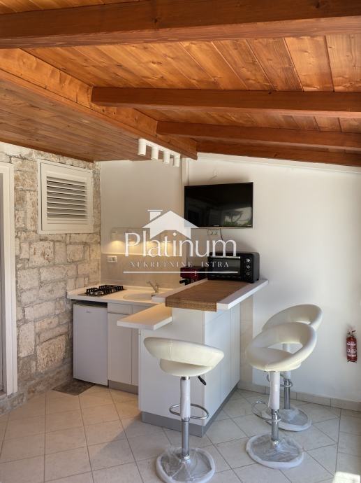 Prodaje se samostojeća kuća na tri etaže, na vrlo atraktivnoj lokaciji, udaljena svega 50 m od mora i prekrasne plaže. Kuća se sastoji od prostranog i komfornog stana na prvom katu površine 110,7 m², manjeg stana u prizemlju površine 33 m², dok se u suterenu nalazi garažni prostor od 21 m². Na prizemni stan nadovezuju se zimski vrt, konoba od 16 m² te velika natkrivena terasa od 34 m². Prizemni je dio kuće natkrivenim prolazima povezan s dodatnim sadržajima te orijentiran prema prostranoj terasi i vrtu s kivijem i dekorativnim biljem, što osigurava privatnost i ugodan mediteranski ugođaj. U zimskom vrtu je mala kuhinja i kutak za opuštanje. Prizemni je stan natkrivenim prolazima povezan s ljetnom kuhinjom odnosno konobom s pomičnom staklenom stijenom okrenutom prema jugu, iz koje se izlazi na natkrivenu terasu s kaminom/roštiljem, idealnu za boravak tijekom cijele godine. Okućnica je prekrasno uređena bogatim zelenilom i cvijećem, skladno uklopljena u cjelokupan prostor i pruža osjećaj mira i privatnosti. Uz samu kuću nalazi se parkirni prostor za tri vozila, od čega je jedno parkirno mjesto natkriveno i zaštićeno pergolom.