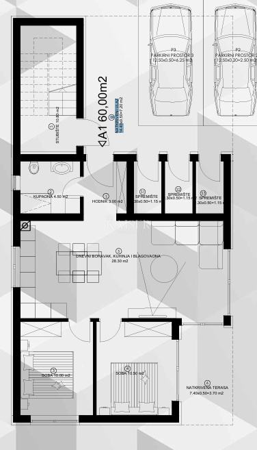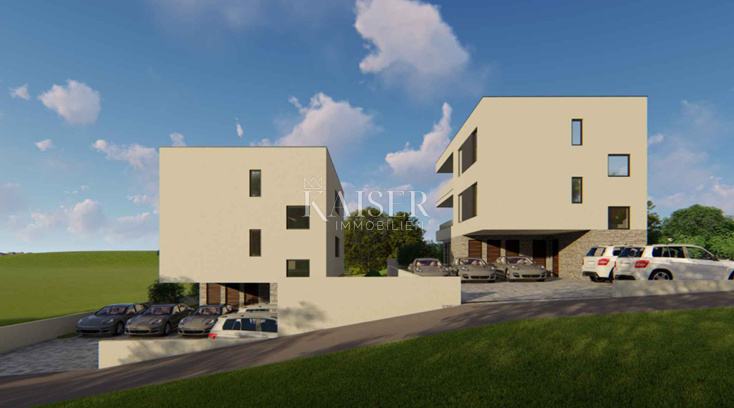 Kaiser Immobilien vam predstavlja luksuzan stan od 60m² smješten u prizemlju moderne stambene zgrade na izuzetnoj lokaciji. Stan se sastoji od natkrivenog ulaza površine 14,40m² koji vodi u hodnik od 3m², s desne strane nalazi se moderna kupaonica od 4,50m², dok se ravno ulazi u prostrani dnevni boravak s blagovaonicom i kuhinjom otvorenog tipa površine 28,30m². Stan ima dvije spavaće sobe, jednu od 10m² i drugu od 10,50m², pri čemu veća soba i dnevni boravak imaju izlaz na natkrivenu terasu od 7,40m² s pogledom na Pješčanu Uvalu koja vodi do vrta od približno 120m². Uz stan dolazi i spremište od 3m².