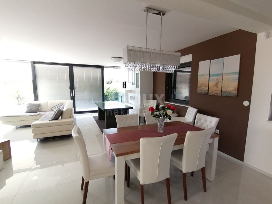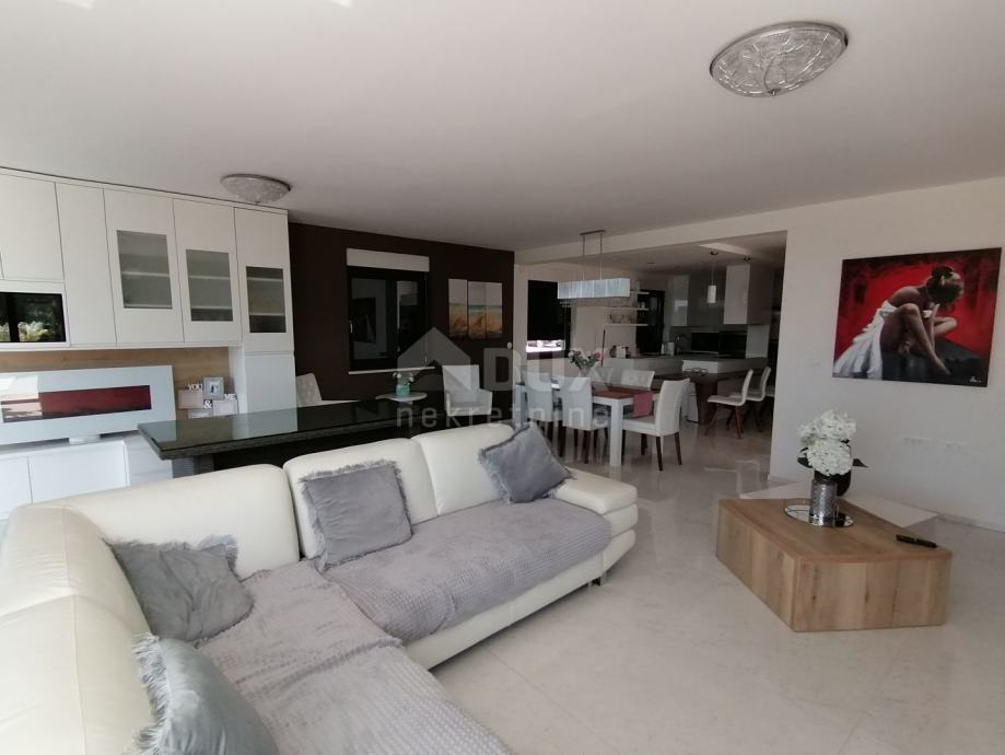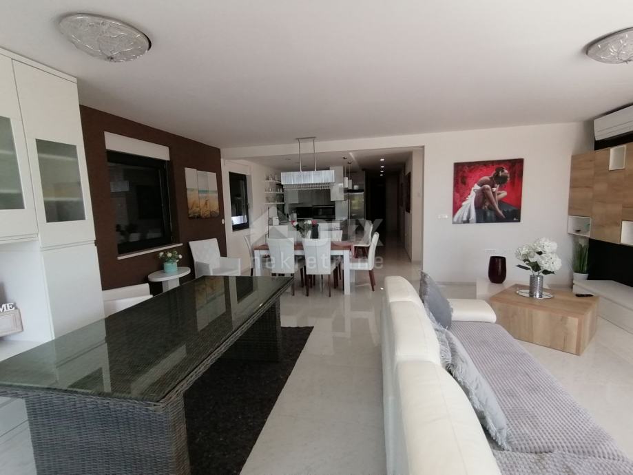 Stan se sastoji od ukupnih 206m2 stambenoga prostora, a na samome ulazu u stan nalazi se predvorje s garderobom koje nas dalje vodi prema dnevnom dijelu stana. Tako se moderna i luksuzno opremljena kuhinja, blagovaona i dnevni boravak nalaze u zajedničkoj "open space" prostoriji bez pregradnih zidova. Ono što boravak u ovome dijelu stana čini posebnim jesu veće staklene stijene uz pomoć kojih je prostor osunčan prirodnim dnevnim svjetlom, te i kroz koje se pristupa prema uređenome okolišu stana, terasi i bazenu sa sunčalištem.