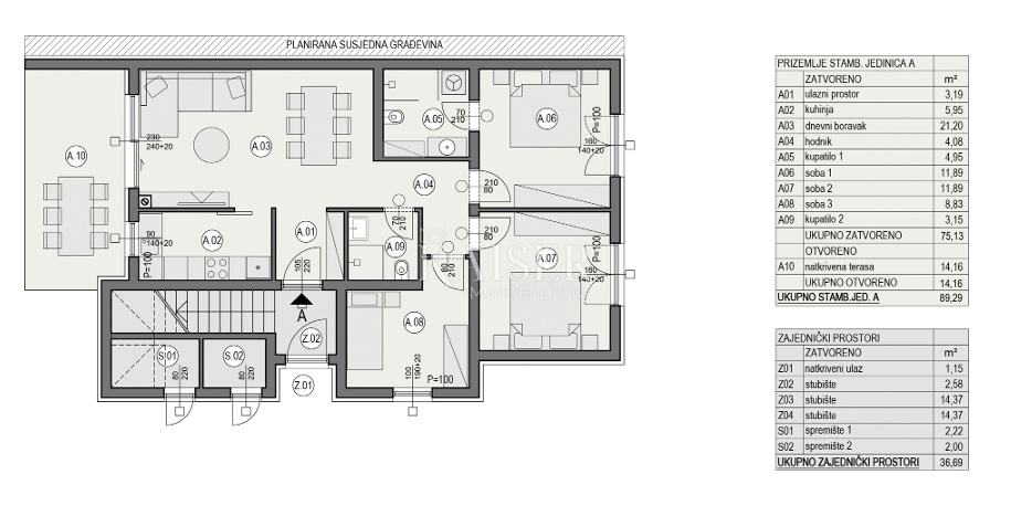 Ulazite u prostrani hodnik koji vas vodi u elegantni dnevni boravak i blagovaonicu, ukupne površine 21,20 m², savršeno za obiteljska okupljanja ili opuštanje s prijateljima. Kuhinja je smještena u zasebnu prostoriju od 5,95 m², pružajući vam prostor za kuhanje bez ometanja drugih dijelova stana. Iz dnevnog prostora izlazite na natkrivenu terasu površine 14,16 m², koja vodi do vašeg vlastitog vrta od oko 60 m² – savršenog za jutarnju kavu, opuštanje ili obiteljske roštilje.