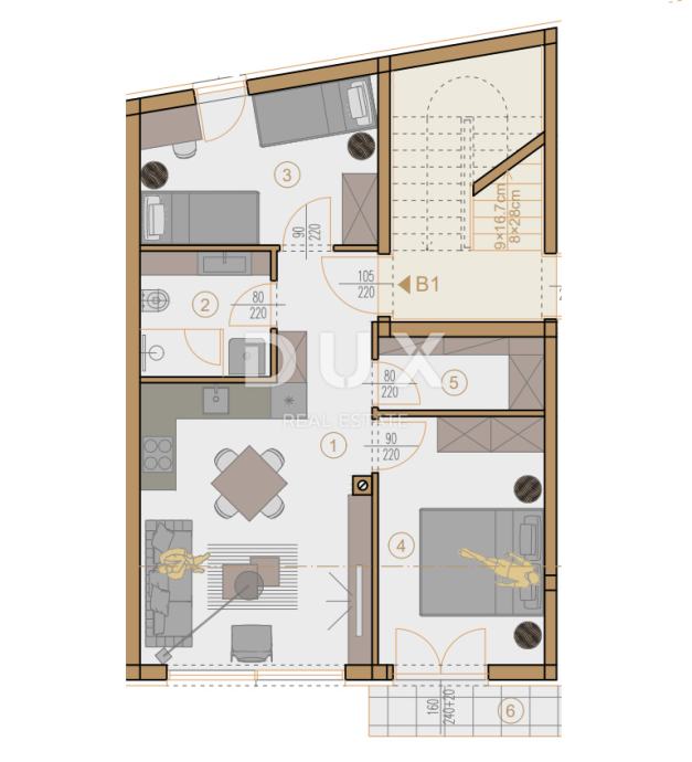 Predmetni stan nalazi se na u prizemlju zgrade. Sastoji se od ulaznog hodnika, "open space" dijela u kojem se nalaze dnevni boravak s izlazom na balkon te kuhinja s blagovaonicom i ostavom. Prostor je osunčan dnevnom svjetlošću koja ulazi kroz staklene stijenke terase. Stan sadrži i dvije prostrane spavaće sobe te kupaonicu. Novi vlasnici moći će uživati i u vlastitom vrtu od 51m2 a koji okružuje obje strane stambene jedinice.