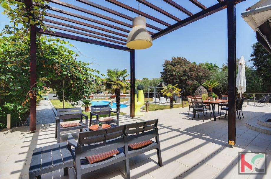 Iz dnevnog boravka izlazimo na terasu i zelenu, pažljivo uređenu okućnicu sa bazenom.
