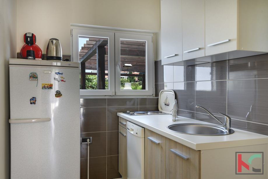 Moderno je namještena biranim komadima namještaja i kvalitetnim uređajima bijele tehnike.