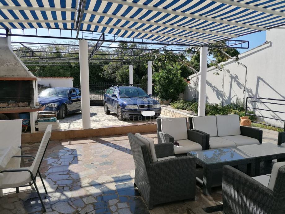 Ispred kuće se nalazi veće popločeno dvorište na koje je moguće parkirati 4 automobila, ali isto tako i roštilj i većom polu natkrivenom terasom. Uz prednje dvorište smjestila se i konoba od 50m2, kao i garaža od 50m2 za komotan parking od 4 automobila i vlastitim kupatilom. Na jednom od parking mjesta u garaži postoji i kanal ispod automobila.