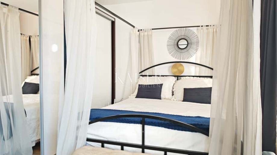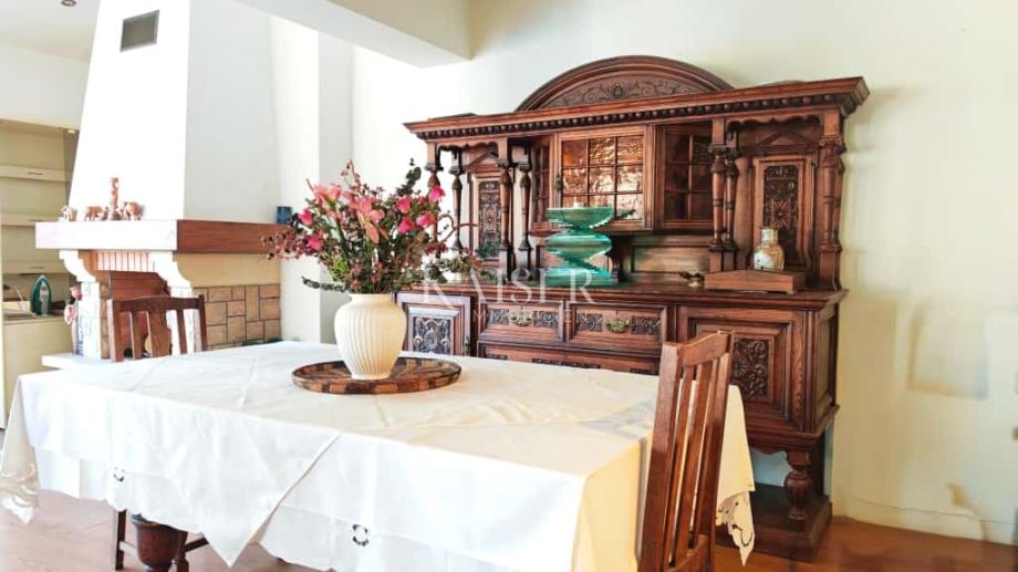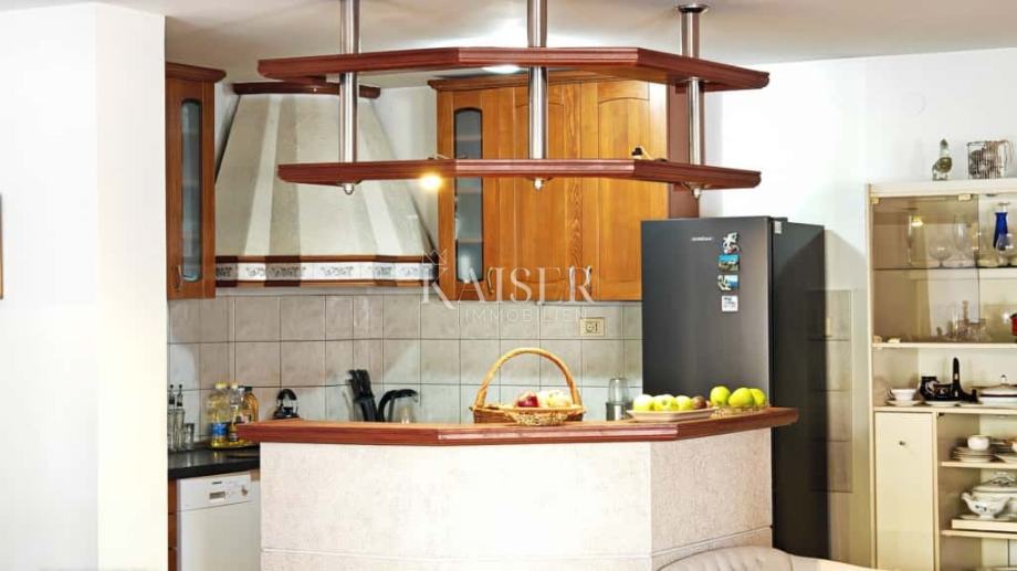 Ulazni hodnik površine 7,26 m² vodi do zasebnih ulaza u svaki stan. Veći stan već pri samom ulasku otkriva prostranu kupaonicu od 12,42 m² opremljenu kadom, tuš-kabinom, WC-om i priključkom za perilicu rublja. Nastavak prostora vodi u iznimno svijetao i otvoren dnevni boravak s kuhinjom i blagovaonicom u jednoj cjelini. Zahvaljujući velikim staklenim stijenama, prostor je obasjan prirodnim svjetlom tijekom cijelog dana. Kuhinja, smještena na 16,16 m², izrađena je po mjeri, dok se odmah uz nju nalazi blagovaonski dio od 32,57 m² s prekrasnim kaminom, što čini ukupno gotovo 49 m² udobnog i funkcionalnog prostora. Dnevni boravak prostire se na otprilike 12 m², a kroz prostrani hodnik od približno 12 m² dolazi se do spavaće sobe površine oko 12 m².
