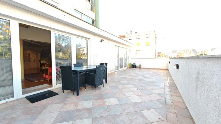 Najimpresivniji dio većeg stana svakako je velika terasa od čak 44,04 m², na koju se izlazi iz dnevnog prostora. Terasa je okrenuta prema jutarnjem suncu i pruža izniman potencijal za uređenje – od ljetne kuhinje, lounge zone ili vrta u posudama, a dodatnu praktičnost pruža i manja zatvorena ostava. Cijeli prostor dodatno je naglašen elegantnim mramornim stupovima koji daju dašak profinjenosti.