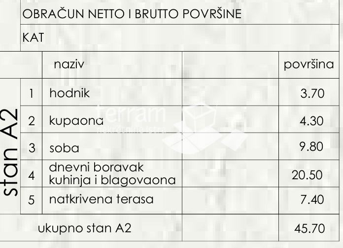 Istra, Pula, okolica prodaje se novi stan na prvom katu stambene zgrade. Stan veličine 50m2 sastoji se od: ulaznog hodnika, jedne spavaće sobe, kupaonice, kuhinje s blagavaonom, dnevni boravak s izlazom na natkrivenu terasu terasu, spremišta i parkirnnog mjesta. Stan će biti opremljen kvalitetnom keramikom i sanitarijama, klima uređaj te podno grijanje u kupaonici. Po želji kupca može se postaviti podno grijanje u ostalim prostorijama u stanu.