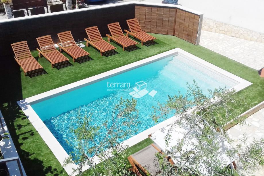Uređena okućnica s bazenom od 25 m2, sunčalištem, vanjskim tušem, roštiljom i pet parkirnih mjesta.