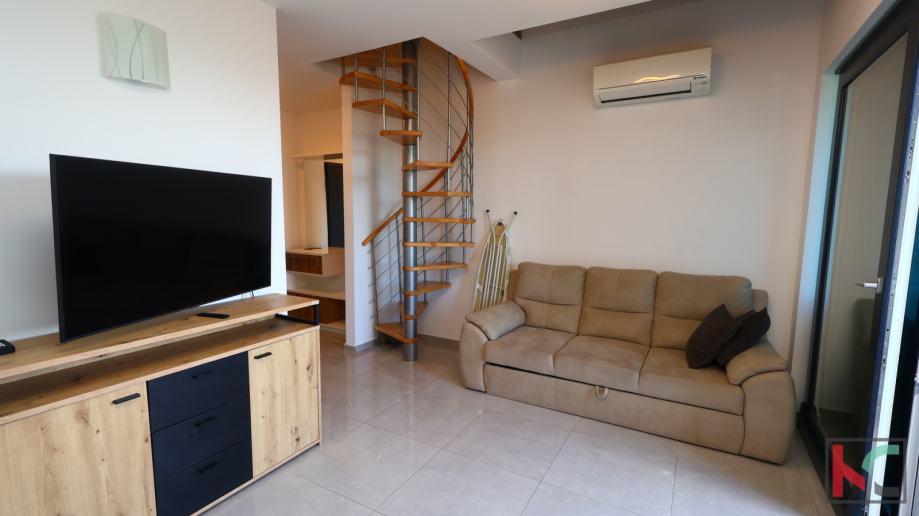 Smjestio se na drugom katu održavane zgrade novije gradnje sa liftom. Prostire se na dvije etaže. Donja etaža sastoji se od kuhinje sa blagavaonom i dnevnim boravkom, kupaonice, spavaće sobe i natkrivene terase sa predivnim pogledom na more. Kružne stepenice nas vode na mansardu gdje se nalazi još jedna komforna spavaća soba. Stanu pripada spremište i jedno parkirno mjesto u garaži zgrade.