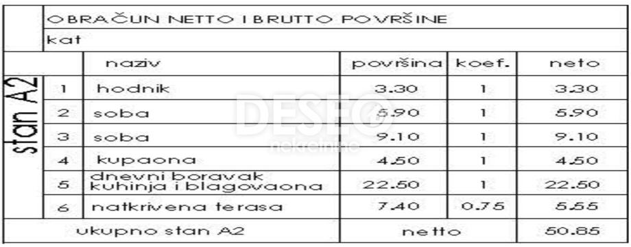 Stan se nalazi u na prvom katu i sastoji se od ulaznog hodnika, dnevnog boravka i kuhinje s blagovaonom, spavaće sobe, kupaonice , te lođe ukupne neto površine 50,85 m2.