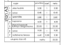 Predmetni stan nudi 55m2 stambenog prostora te mu pripada parkirno mjesto (2,75 m2- prema koeficijentu) , spremište 1 m2 ukupne površine 58,75m2
