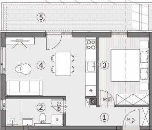 . Stan se sastoji od: dnevnog boravka sa kuhinjom, kupaona, hodnik, 1 spavaća soba, terasa i vrt 75m2. U prizemlju zgrade nalazi se spremište te stan ima jedno parkirno mjesto.