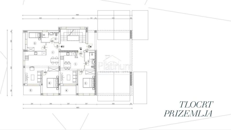 Centralni dio rasporeda stana čini prostrani open spaces prostor koji objedinjuje kuhinju, dnevni boravak i blagovaonicu,dvije spavaće sobe i kupaonicu. Iz tog prostora izlazi se na privatnu lođu stana, iz koje se dalje pristupa privatnom vrtu površine 97 m2. Stanu pripada i jedno parkirno mjesto koje se nalazi odmah uz vrt, budućem kupcu mogućnost postavljana i natkrivenog parkirnog mjesta.