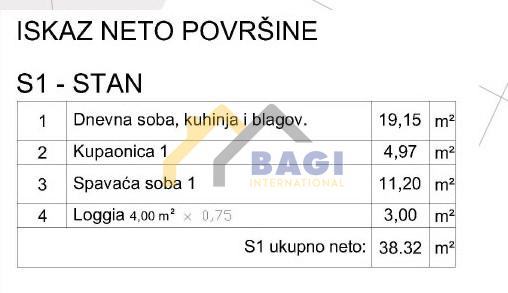 Stan se sastoji od funkcionalne spavaće sobe, prostranog dnevnog boravka koji nudi dovoljno svjetlosti, kupaonice te loggie koja omogućuje uživanje na otvorenom. Svi prostori su optimalno iskorišteni, stvarajući udoban i praktičan ambijent za svakodnevno življenje.