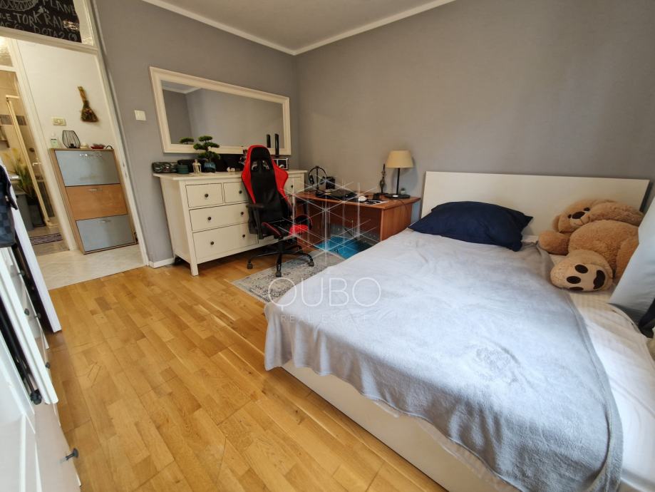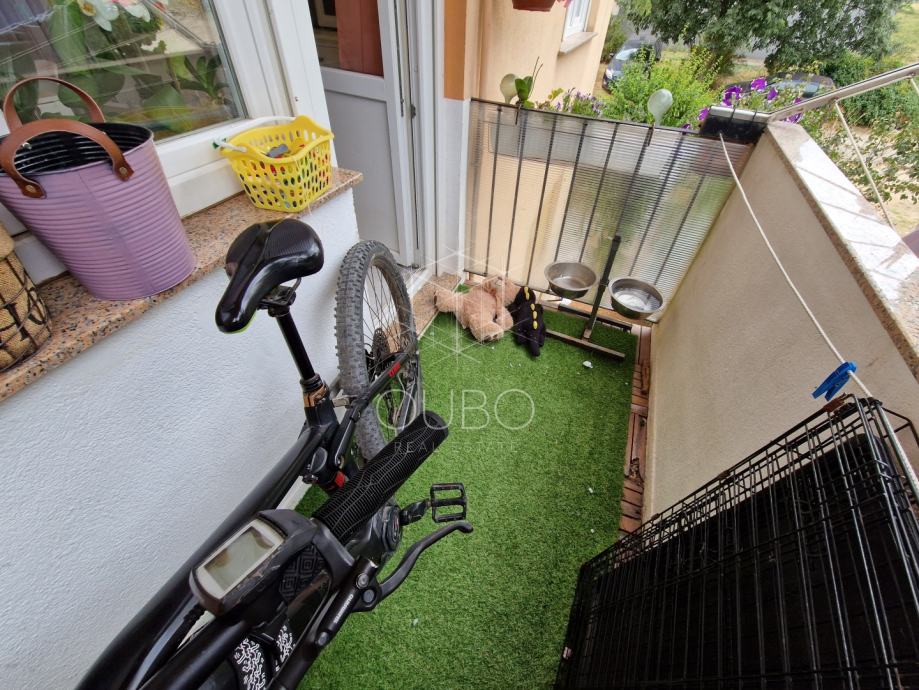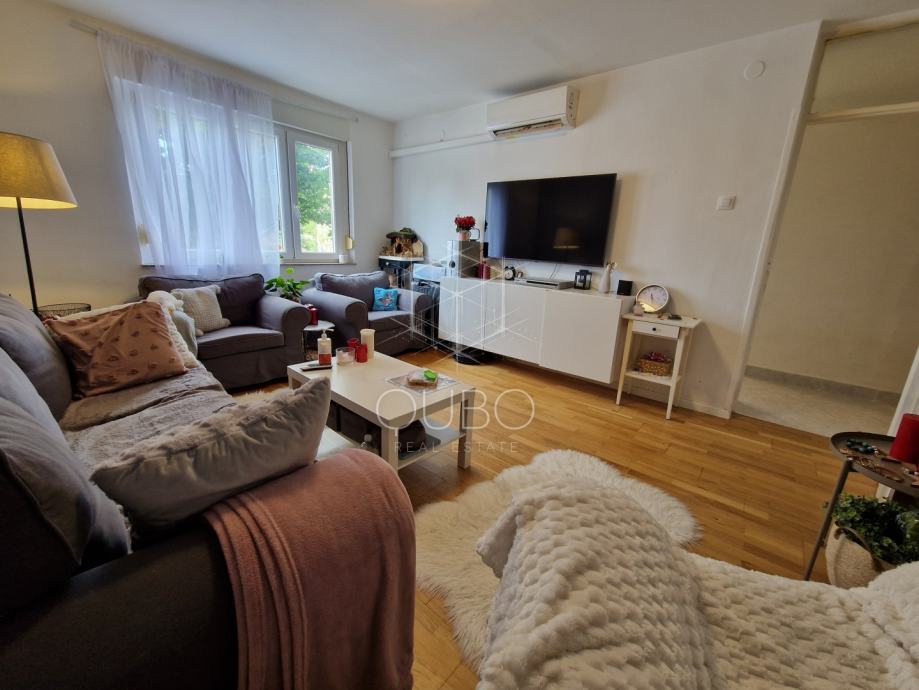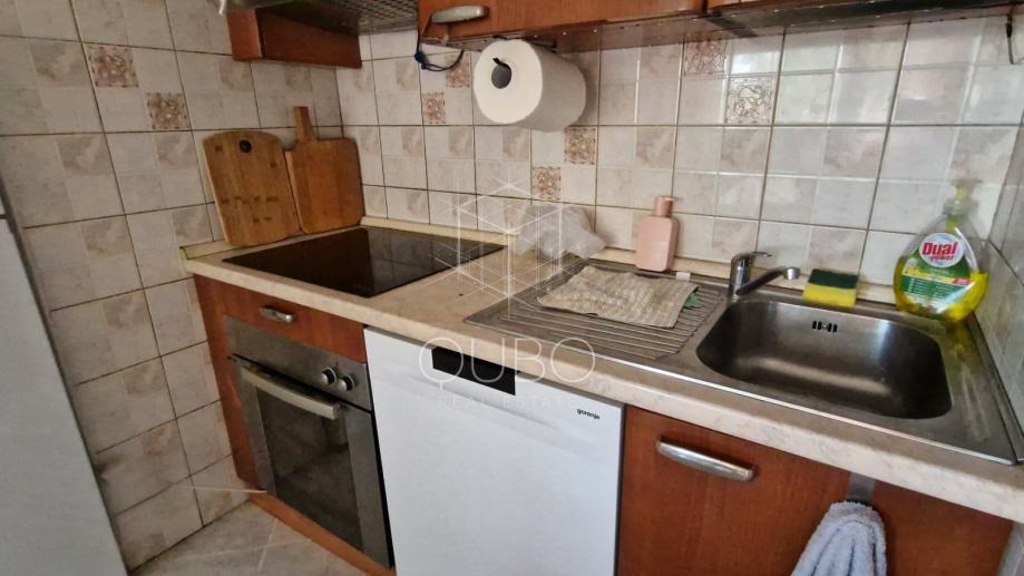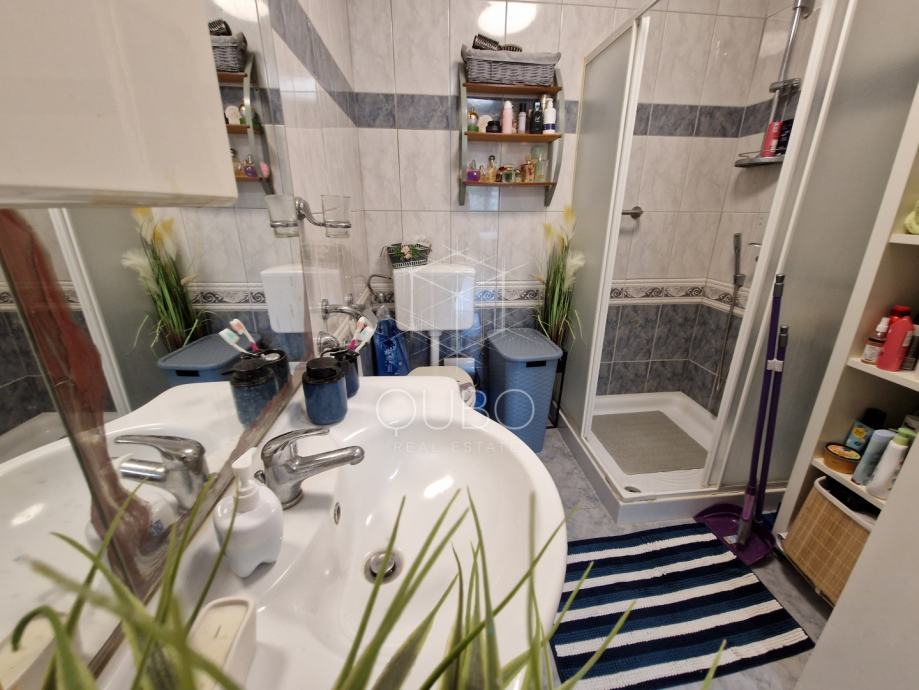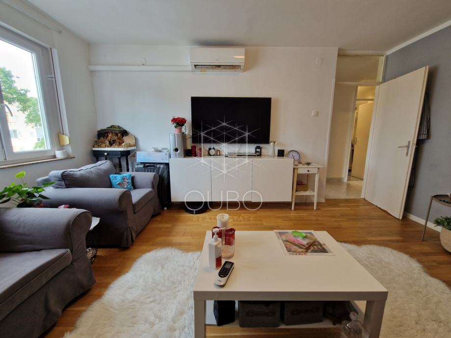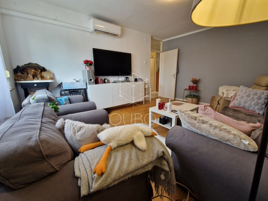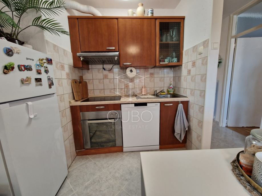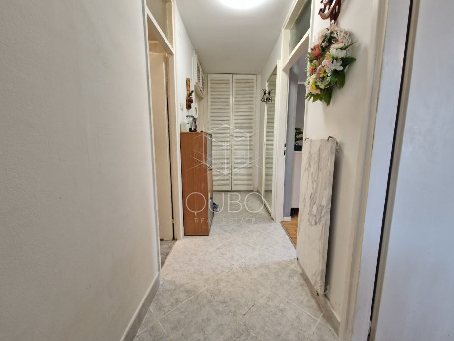 S površinom od nešto više od 53 m², prostor je raspoređen jasno i funkcionalno. Hodnik s ugradbenim ormarima povezuje sve prostorije – dnevni boravak, spavaću sobu, kupaonicu s tuš kabinom te kuhinju s blagovaonicom koja izlazi na balkon. Stan je klimatiziran i održavan, a raspored pruža mogućnosti prilagodbe prema potrebama novog vlasnika.