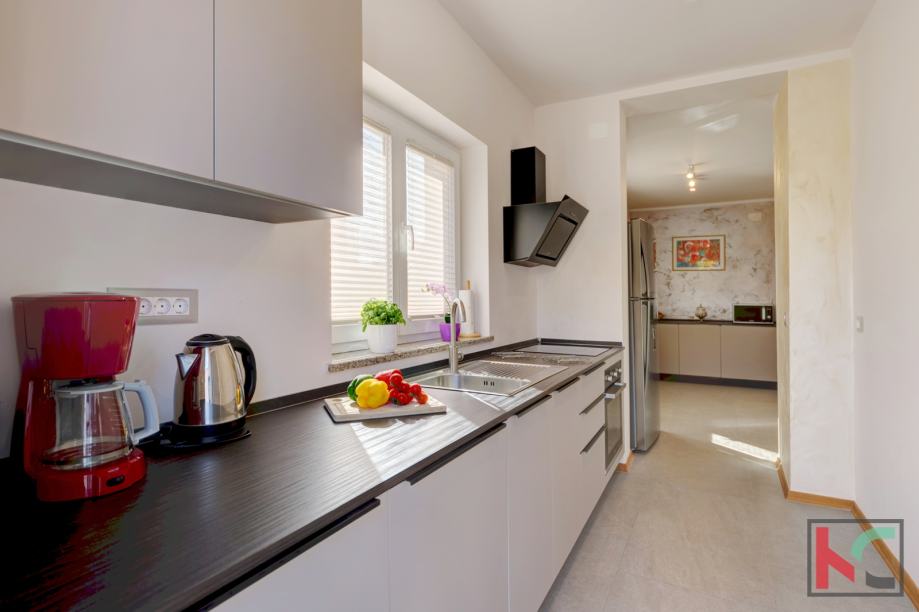 U prizemlju se nalazi kuhinja, koja se otvara prema prostranom dnevnom boravku i blagovaonici s izlazom na veliku terasu smještenu iza kuće sa ljetnom kuhinjom i bazenom. Master spavaća soba s vlastitom kupaonicom i garderobom, jedna dodatna kupaonica, gostinjski toalet, zasebni ured koji može služiti i kao spavaća soba, tehnička soba te dodatna soba koja trenutno služi kao spremište/soba za peglanje.