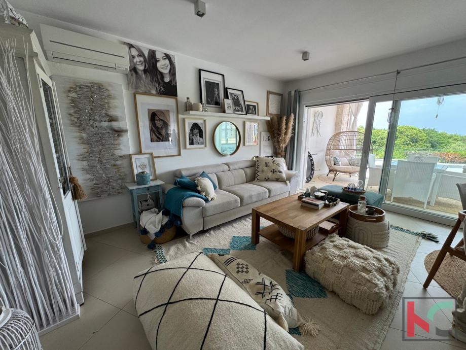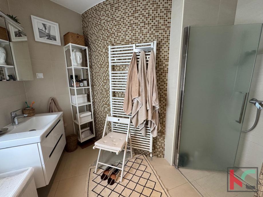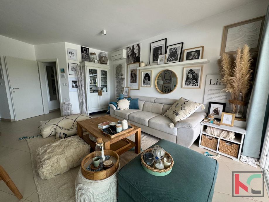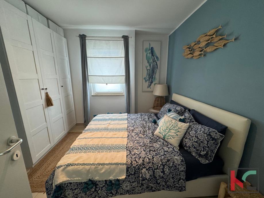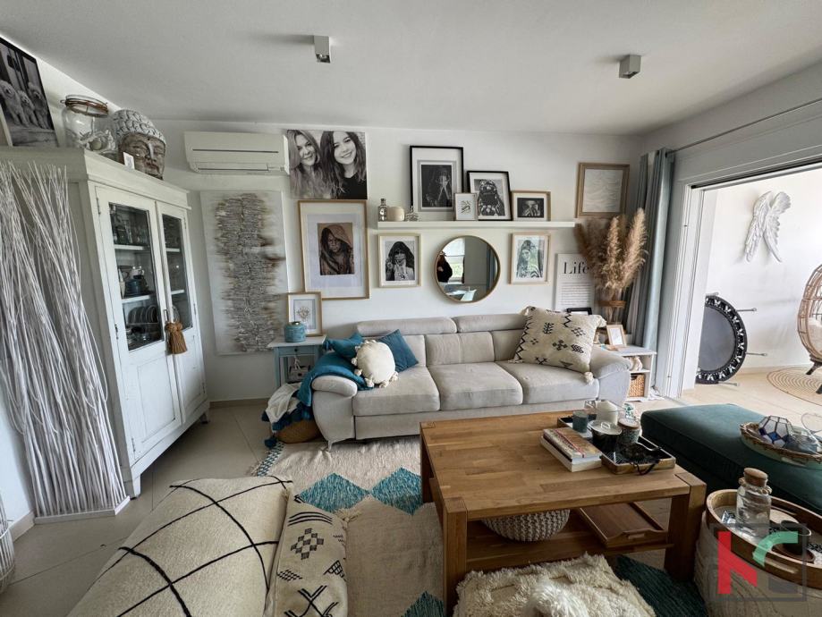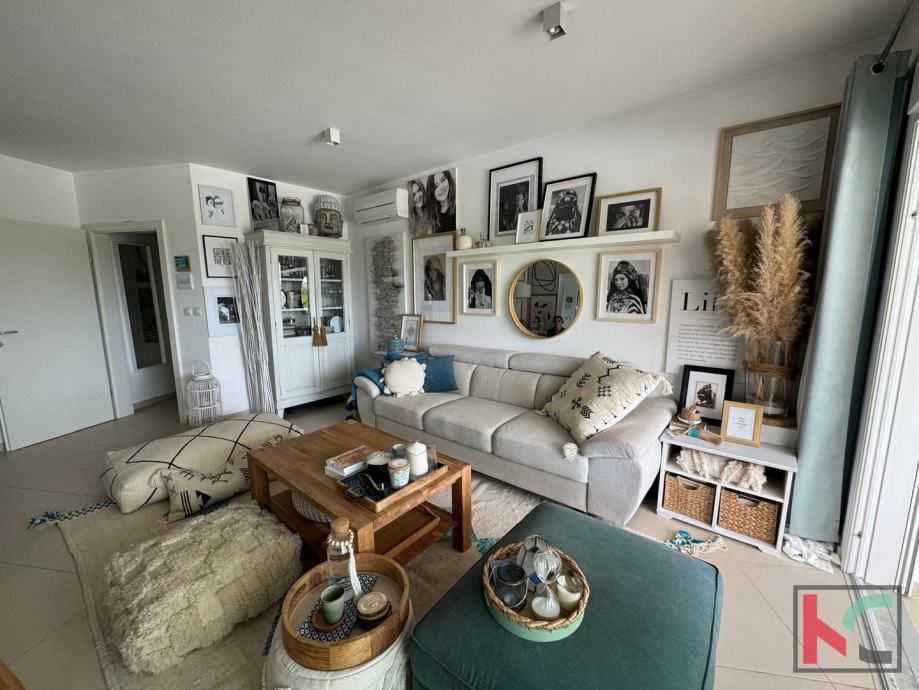 Nekretnina površine 84,60 m2 sastoji se od ulaznog hodnika, prostranog dnevnog boravka u komunikaciji sa kuhinjom te sa izlazom na terasu s pogledom na more, dvije svapaće sobe, kupaonica te ostava (vešeraj).