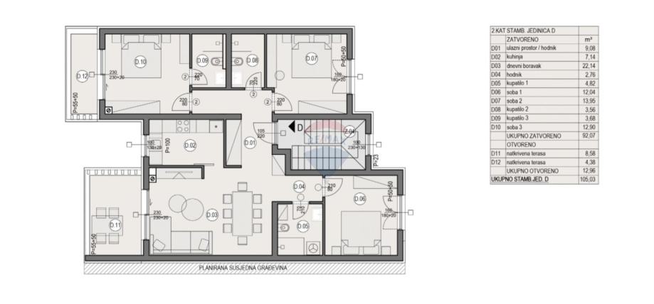 Ulaskom u stan dočekuje vas prostran ulazni prostor od 9 m² koji vodi prema prozračnom dnevnom boravku površine 22 m². Kuhinja je odvojena, dizajnirana tako da nudi privatnost, ali i funkcionalnost potrebnu u svakodnevnom životu. Ovaj stan raspolaže s tri spavaće sobe, od kojih se jedna ističe kao raskošni master suite s vlastitim luksuznim kupatilom i privatnom terasom – prostor koji pruža potpunu intimu i mir.