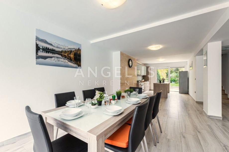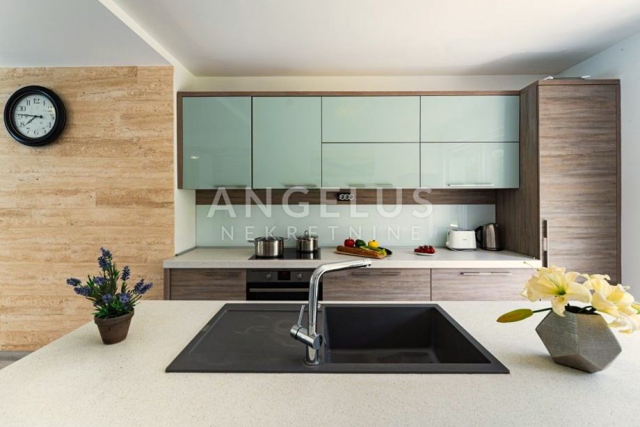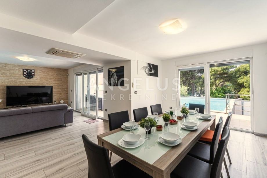Vila se prostire na 285 m² i raspoređena je na tri etaže. Prizemlje uključuje dnevni boravak, blagovaonicu i potpuno opremljenu kuhinju u otvorenom konceptu, s direktnim izlazom na sunčalište i privatni bazen (8x7 m). Na ovoj etaži se također nalazi gostinjski toalet.