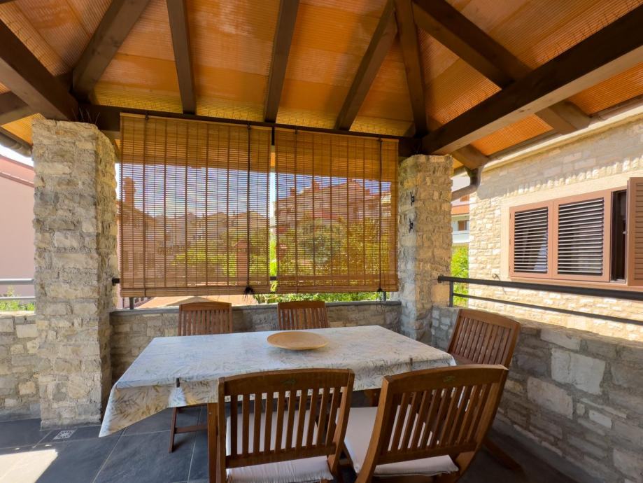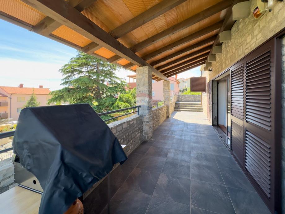 Stan na prvom katu(100 m2 ),sastoji se od:prostranog dnevnog boravka sa blagovaonom i kuhinjom,4 spavaće sobe,kupaonice,wc-a i predivne natkrivene terase od 30 m2.