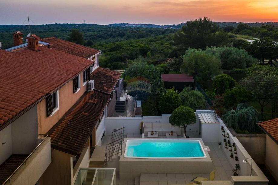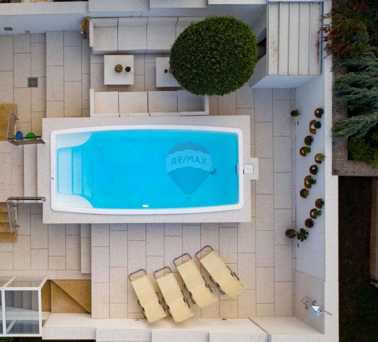 gdje se nalazi prostran jacuzzi, dok se na prednjoj strani kuće nalazi još jedna prostrana terasa iz na koju se ide dnevnog boravka, a s koje seže lijep pogled na more.