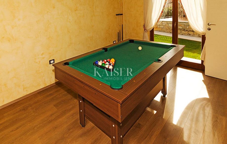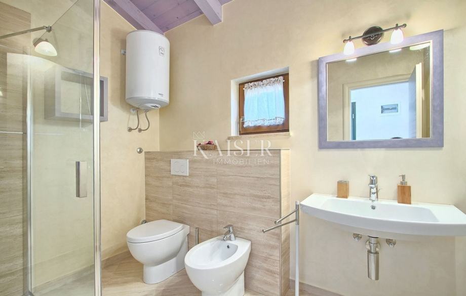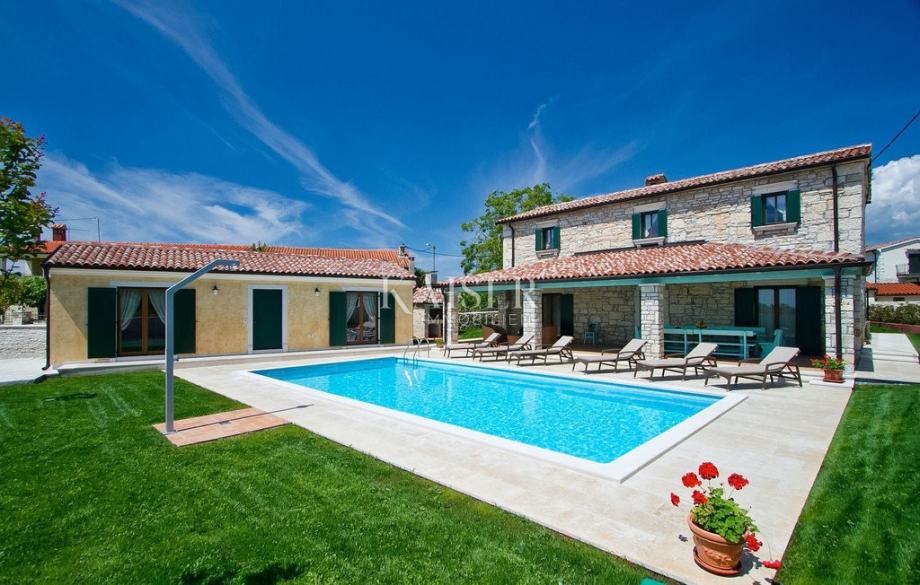 Poseban štih cijeloj okućnici daje veliki bazen površine 50 m2, sa sunčalištem i vanjskim tušom i kamenim roštiljom. Ta predivna terasa daje izvanredan ambijent za opuštanje i druženje, a okružuje ju travnjak sa sustavom za navodnjavanje.