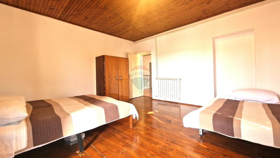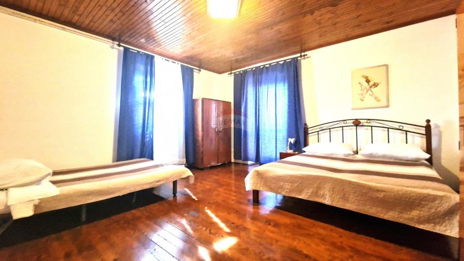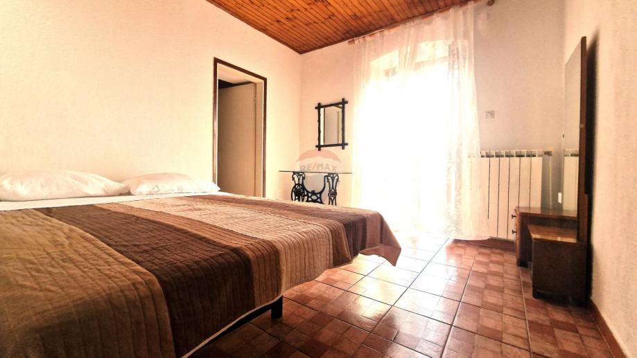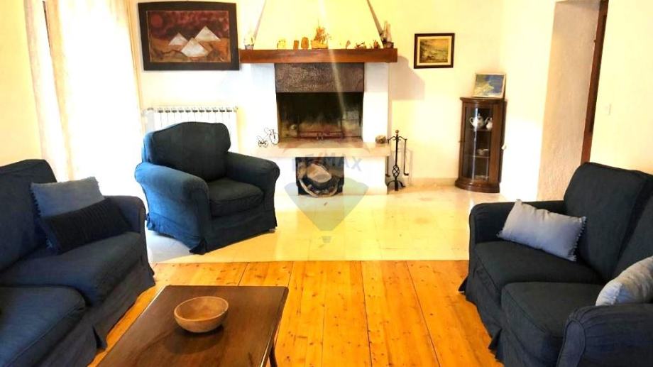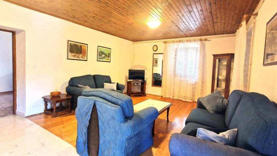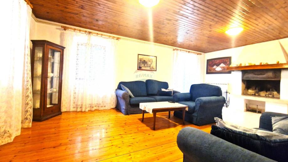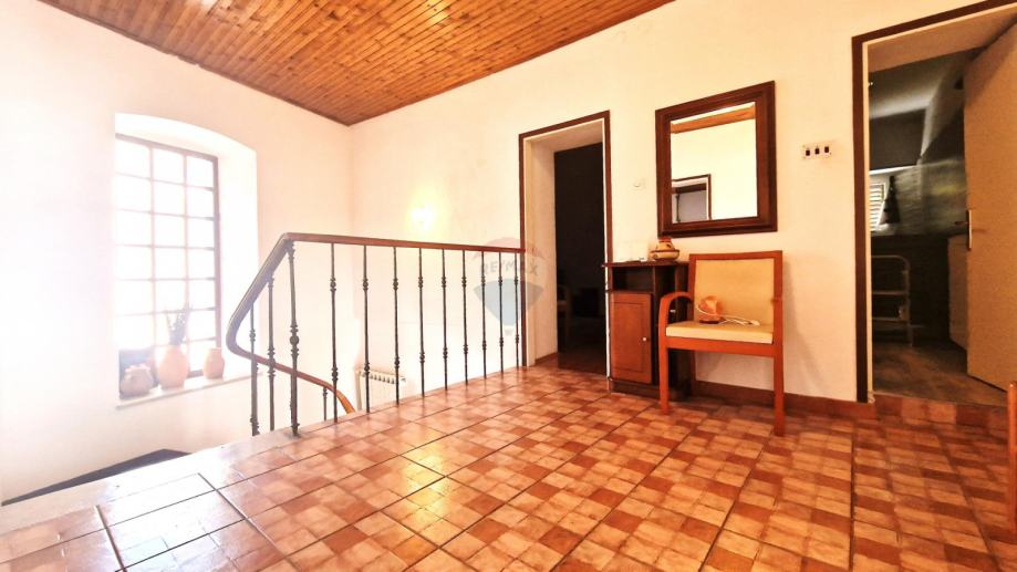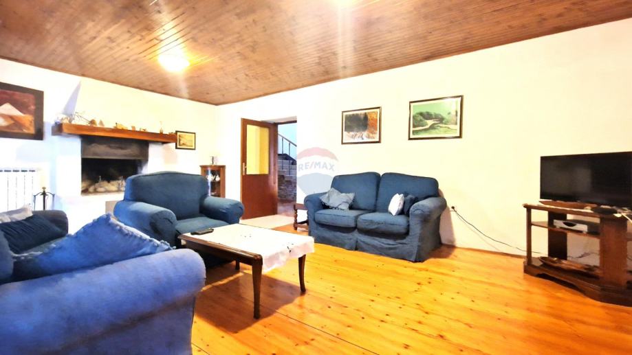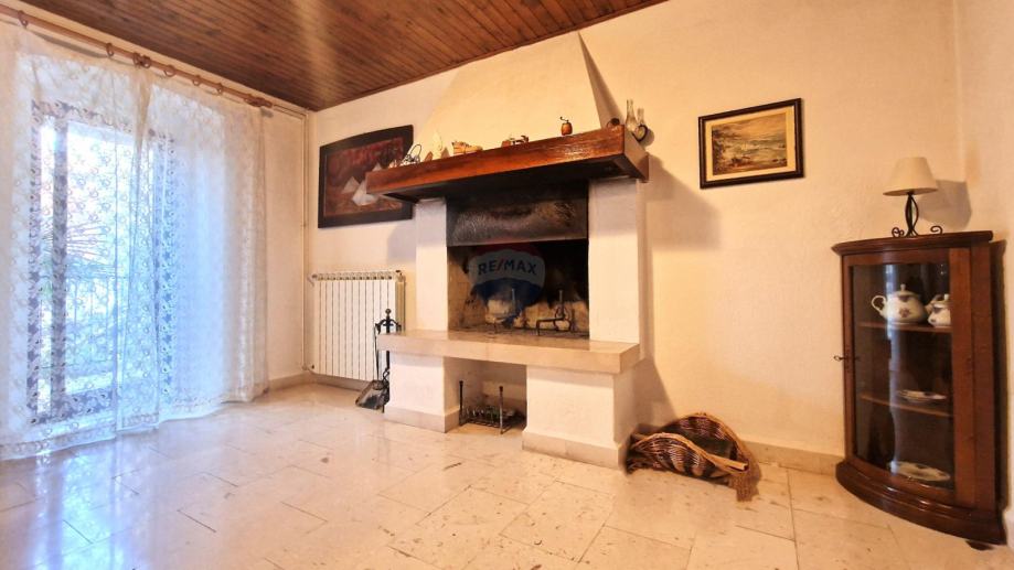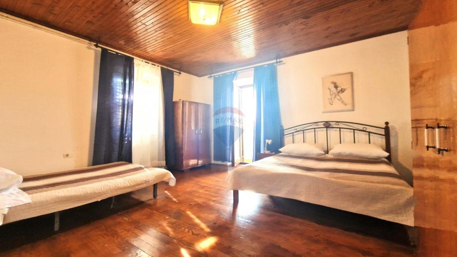 U prizemlju kuće nalazi se veliki dnevni boravak s prekrasnim otvorenim klasičnim kaminom i izlazom na terasu,kupaonica, konoba te kotlovnica, dok su na katu smještene kuhinja s balkonom,3 spavaće sobe od kojih jedna ima izlaz na šarmantni balkon i prostrana kupaonica.