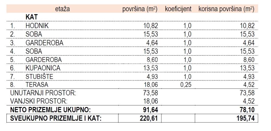 Prodaje se montažna kuća neto površine 195,74 m2 na dvije etaže. Kuća se sastoji od prizemlja i kata. U prizemlju se nalazi garaža, jedna soba, kupatilo, tehnička soba, kuhinja i dnevni boravak s izlazom na natkrivenu terasu. Na katu se nalaze dvije spavaće sobe, svaka sa svojom garderobom i izlazom na terasu. Također, na katu se nalazi i veliko kupatilo u kojem je predviđena sauna, kada i tuš. Pored kuće predviđen je i izgrađen natkriveni prostor za ljetnu kuhinju ili drugu namjenu.