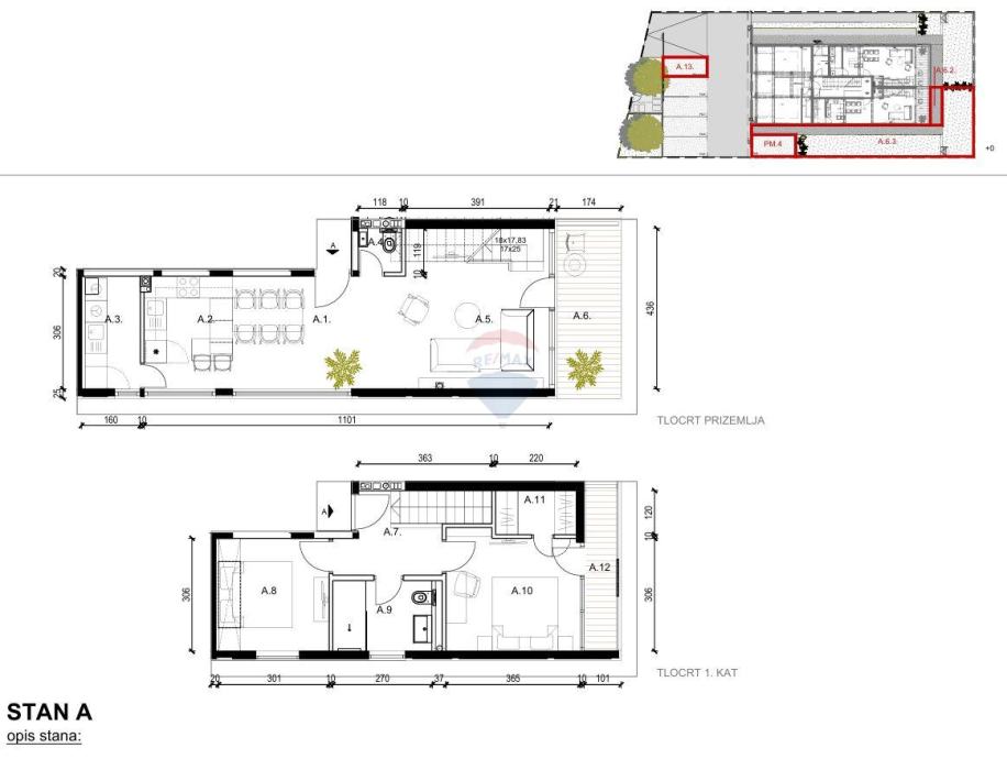 Na atraktivnoj lokaciji u Rovinju prodaje se dvoetažni dvosobni stan ukupne obračunske površine 104,97 m², s neto korisnom površinom od 87,03 m². Stan je orijentiran na jug – zapad, što osigurava obilje prirodnog svjetla tijekom cijelog dana, te pruža ugodan i funkcionalan životni prostor.