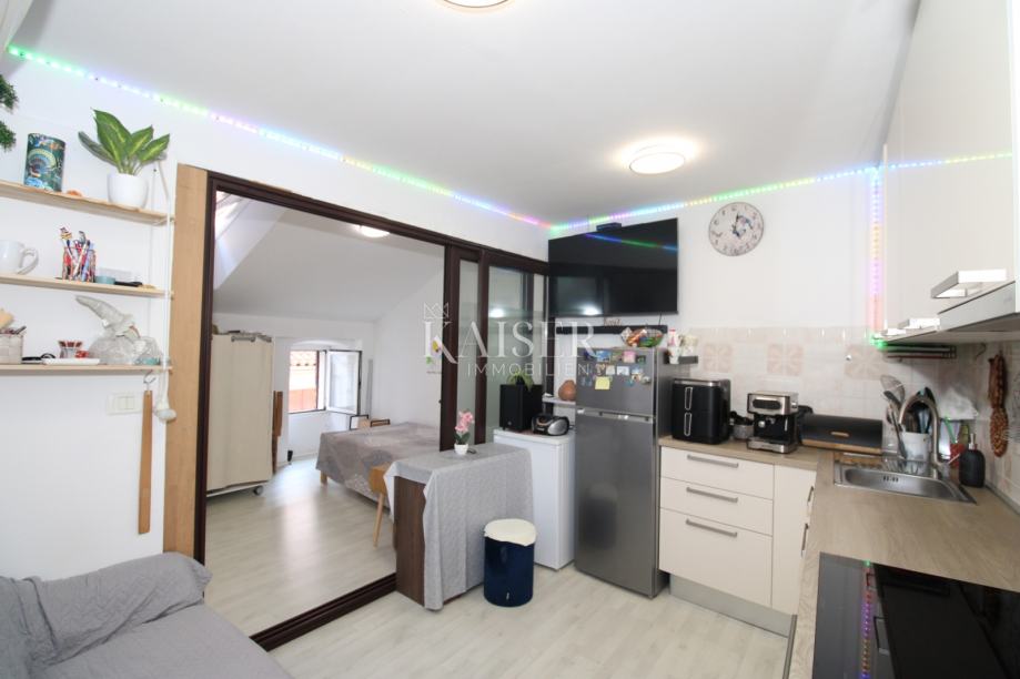 Prvi dio stana, površine oko 30 m², sastoji se od ulaznog hodnika iz kojeg se ulazi u kupaonicu s tušem i WC-om, te kuhinju opremljenu potpuno novim namještajem i aparatima iz 2025. godine. Uz kuhinju se nalazi prostrana soba koja se koristi kao spavaća, no zahvaljujući svojoj kvadraturi i rasporedu pruža mogućnosti za drugačije uređenje. Iz ovog dijela stana pruža se predivan pogled na slikovite rovinjske ulice, a kroz prozor se nazire i vrh zvonika Crkve Sv. Eufemije, jedne od najvećih znamenitosti grada.