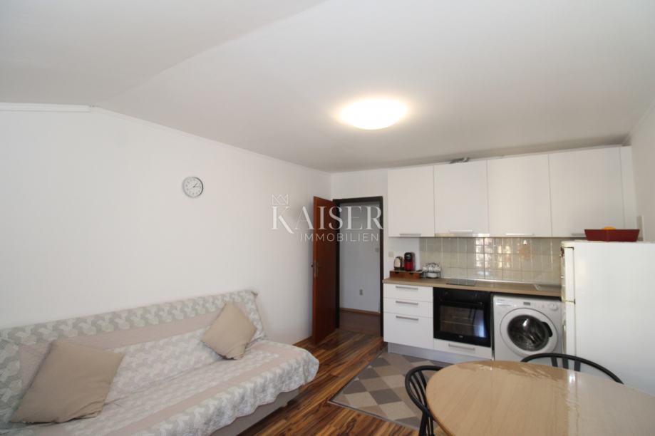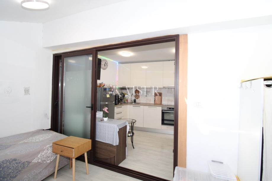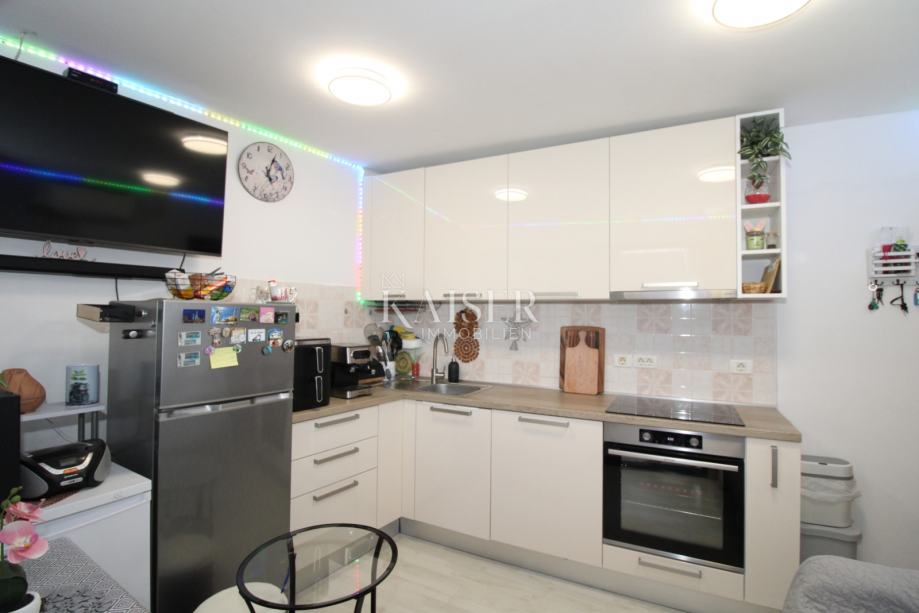 Drugi dio stana, veličine oko 42 m², ima zaseban ulaz preko vanjskog hodnika. Na samom ulazu nalazi se hodnik iz kojeg se pristupa spavaćoj sobi od približno 15 m² s prozorima okrenutim prema moru, što pruža jedinstven doživljaj svakog dana. Dalje se ulazi u prostor koji objedinjuje kuhinju, blagovaonicu i dnevni boravak, a kuhinja je i ovdje potpuno nova i postavljena 2025. godine. Iz dnevnog prostora također se pruža pogled prema moru. Na kraju hodnika nalazi se kupaonica s tušem i WC-om, a u obje kupaonice ove godine zamijenjene su odvodne instalacije i postavljene nove pločice.