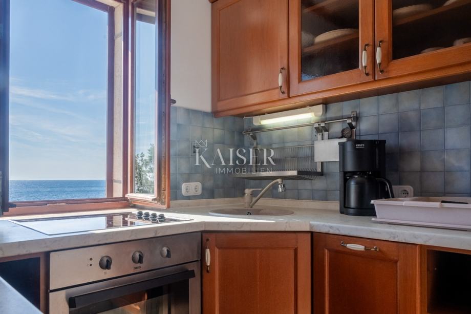 Ravno iz hodnika ulazi se u svijetao i ugodan dnevni prostor u kojem se skladno spajaju kuhinja, blagovaonica i kutak za odmor. Kuhinja je opremljena električnim štednjakom, Zanussi pećnicom te novim hladnjakom Beko sa zamrzivačem, a iako nema napu,ima prozor dorektno iznad štednjaka. Iz kuhinjskog dijela pruža se prekrasan pogled na more, stvarajući poseban doživljaj svakodnevnog kuhanja i boravka. Blagovaonski stol i udoban raspored interijera čine prostor savršenim za opuštanje i uživanje u mirnoj atmosferi starogradske jezgre.