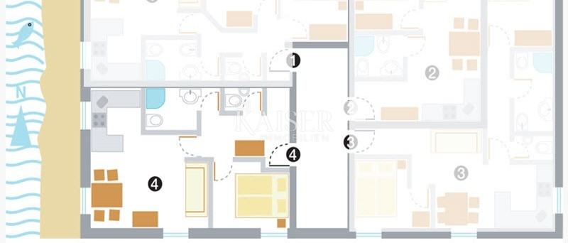 Kaiser Immobilien vam predstavlja šarmantan stan od 40 m² smješten na prvom katu autentične kamene zgrade u samom srcu starog grada Rovinja, na iznimno rijetkoj i cijenjenoj lokaciji – u prvom redu do mora. Već pri ulasku u stan, kroz hodnik u kojem se nalazi praktično garderobno mjesto, osjeća se ugodan mediteranski ambijent koji prožima cijeli prostor. S desne strane hodnika smješten je gostinski WC, a odmah nakon njega i kupaonica s tušem, WC-om i priključkom za perilicu rublja, uređena tako da zadovolji potrebe svakodnevnog boravka uz zadržavanje jednostavnog, tradicionalnog štiha.