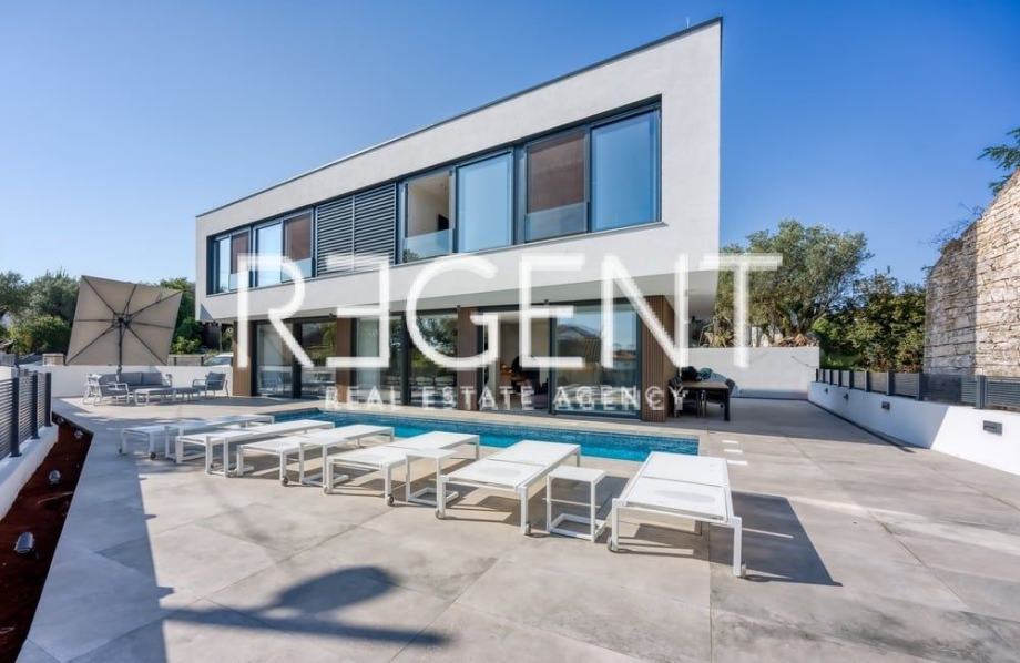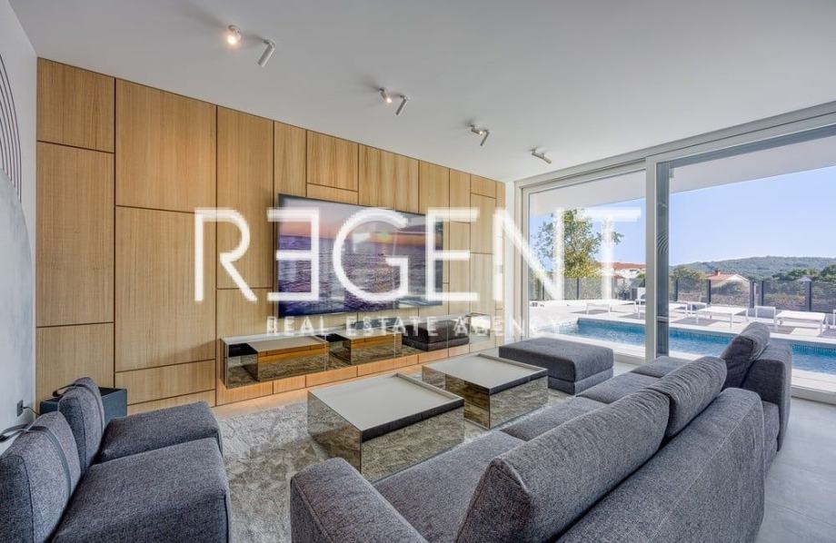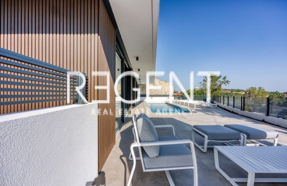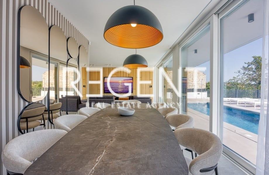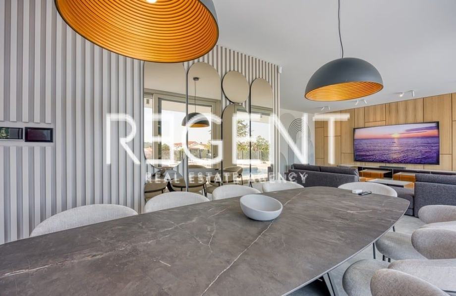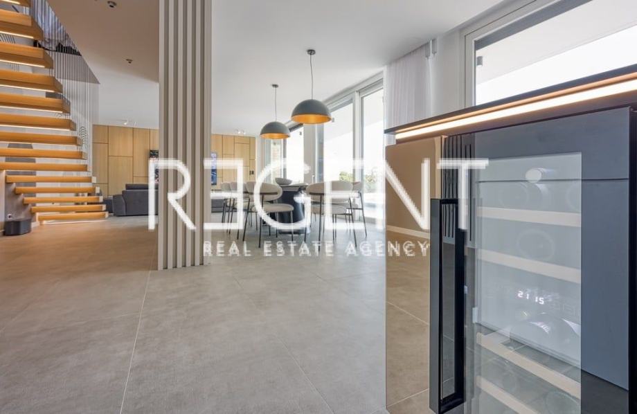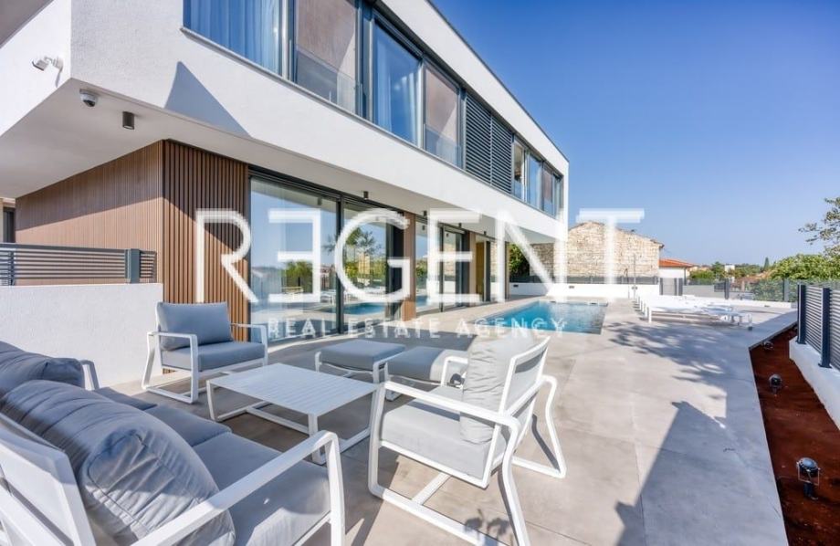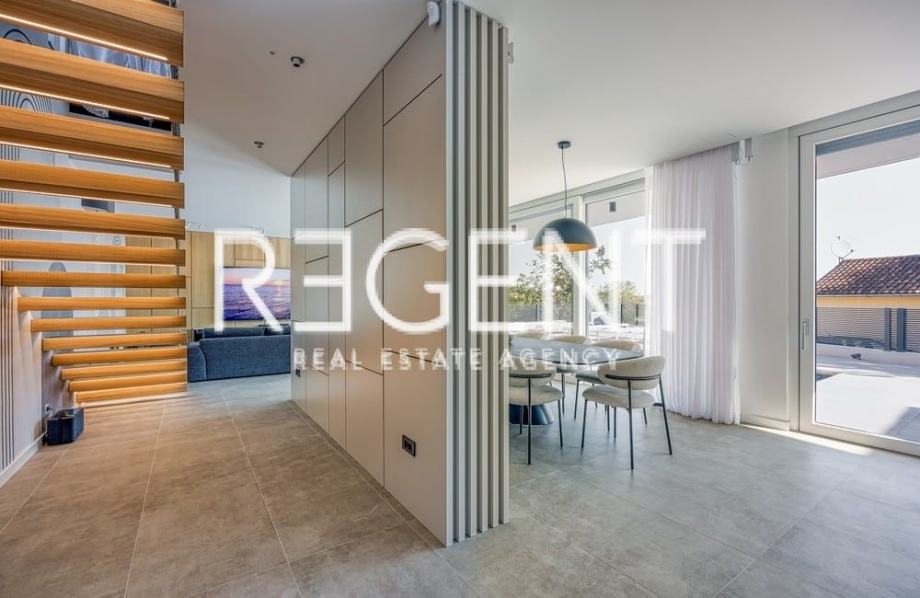 Samo 5 km od šarmantnog Rovinja i njegovih poznatih plaža, u predivnom okruženju Rovinjskog Sela, smjestila se ova moderna i samostojeća ekskluzivna vila. S ukupnom stambenom površinom od 178,62 m² i prostranim zemljištem od 446 m², ovo je idealno mjesto za sve koji traže vrhunski luksuz i udobnost u srcu Istre.O ViliOva luksuzna vila pažljivo je dizajnirana od strane vrhunskih profesionalaca – arhitekata, dizajnera interijera i rasvjete – kako bi pružila nezaboravan boravak i ugođaj. Sastoji se od dvije etaže, koje zajedno čine savršen spoj funkcionalnosti i estetike, a sve to uz pametne tehnologije koje olakšavaju svakodnevni život.Pametni DomVila je opremljena najnovijim pametnim tehnologijama koje omogućuju potpunu kontrolu nad svim aspektima doma. Putem aplikacije na vašem pametnom telefonu možete upravljati sustavom rasvjete, grijanjem, hlađenjem, kao i sigurnosnim sustavima, uključujući video nadzor i alarm. Ovaj napredni sustav nudi vam maksimalnu udobnost i sigurnost, dok istovremeno smanjuje potrošnju energije.PrizemljePrizemlje ove vile otvorenog je koncepta, s prostranim dnevnim boravkom, velikom blagovaonicom i modernom kuhinjom. Tri velike staklene podizno-klizne stijenke omogućuju obilje prirodne svjetlosti i direktan pristup uređenom vrtu i bazenu. Prizemlje također uključuje gostinjski WC i praktično spremište opremljeno vrhunskim uređajima marke Miele, uključujući perilicu i sušilicu rublja, te dizalicu topline za podno grijanje.KatNa katu se nalaze četiri prostrane spavaće sobe, svaka s vlastitom luksuznom kupaonicom. Dvije kupaonice opremljene su elegantnim staklenim vratima u crnoj boji, dok su druge dvije opremljene dizajnerskim drvenim kliznim vratima, koji se savršeno uklapaju s ugradbenim ormarima i zidnim oblogama. Svaka soba opremljena je dizajnerskim tapetama, modernim bračnim krevetima dimenzija 180×200 cm i televizorima, što dodatno doprinosi osjećaju luksuza i udobnosti.Kupaonice su vrhunski opremljene s Geberit podžbuknim vodokotlićima i luksuznim tipkama za ispiranje, Villeroy&Boch sanitarnim uređajima, te Hansgrohe zlatnim pipama i tuševima u sustavu Walk-in s podnim kanalicama za odvodnju vode.Dodatne ZnačajkeStubište: Elegantno lebdeće stubište s čeličnom potkonstrukcijom i drvenim gazištima s integriranim osvjetljenjem, ograđeno brončanim staklom i nehrđajućim čeličnim sajlama.Bazen: Prostrani bazen dimenzija 10×3 metra, savršen za opuštanje u toplim ljetnim danima.Vanjski Prostor: Uređeni vrt, tri asfaltirana parkirna mjesta s mogućnošću dodavanja još dva, uz kliznu dvorišnu ogradu.Namještaj: Vila je potpuno opremljena talijanskim luksuznim namještajem marke Caligaris.Stolarija: Visokokvalitetna PVC stolarija s troslojnim IZO staklima i podnim grijanjem.Ova vila predstavlja savršen spoj modernog dizajna, luksuza i pametne tehnologije, smještena u mirnom dijelu Rovinja, ali ipak dovoljno blizu svih gradskih sadržaja. Ovo je idealna prilika za one koji žele uživati u privatnosti, modernim pogodnostima i luksuzu, dok su u blizini jedne od najljepših destinacija na Jadranu.Za više informacija, kontaktirajte našeg agenta na brojeve telefona: