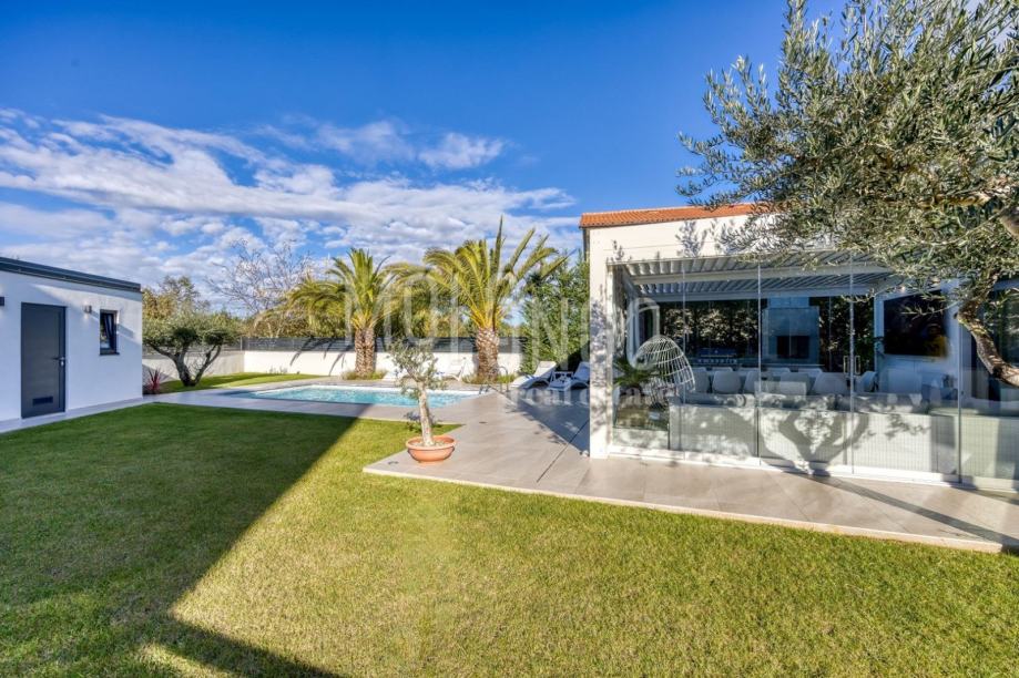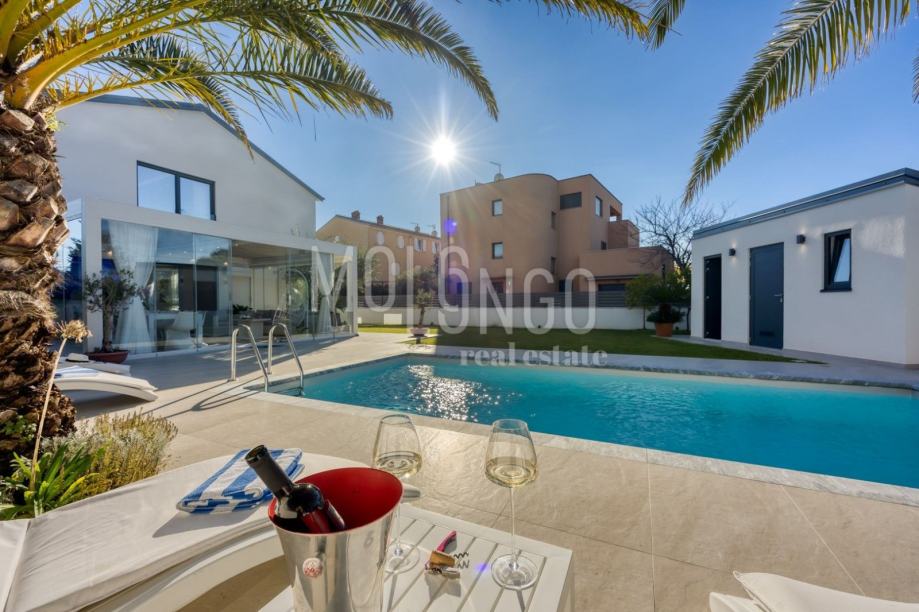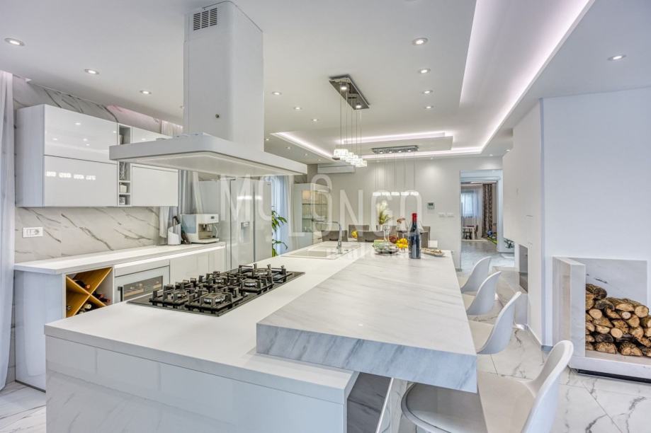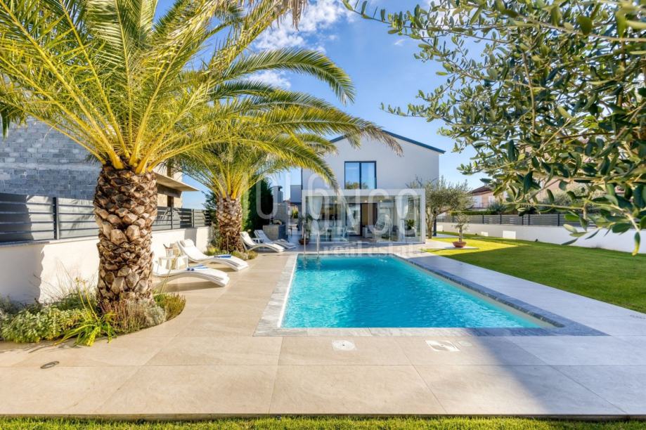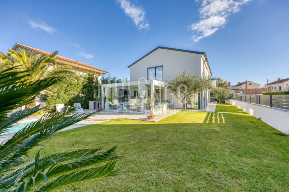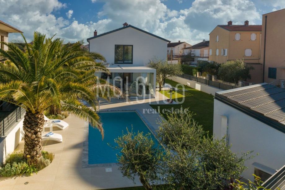 Fantastična vila, od 290m2, udaljena samo 3 km od centra grada Rovinja, smještena je u mirnom okruženju obiteljskih kuća i prirodnog zelenila.