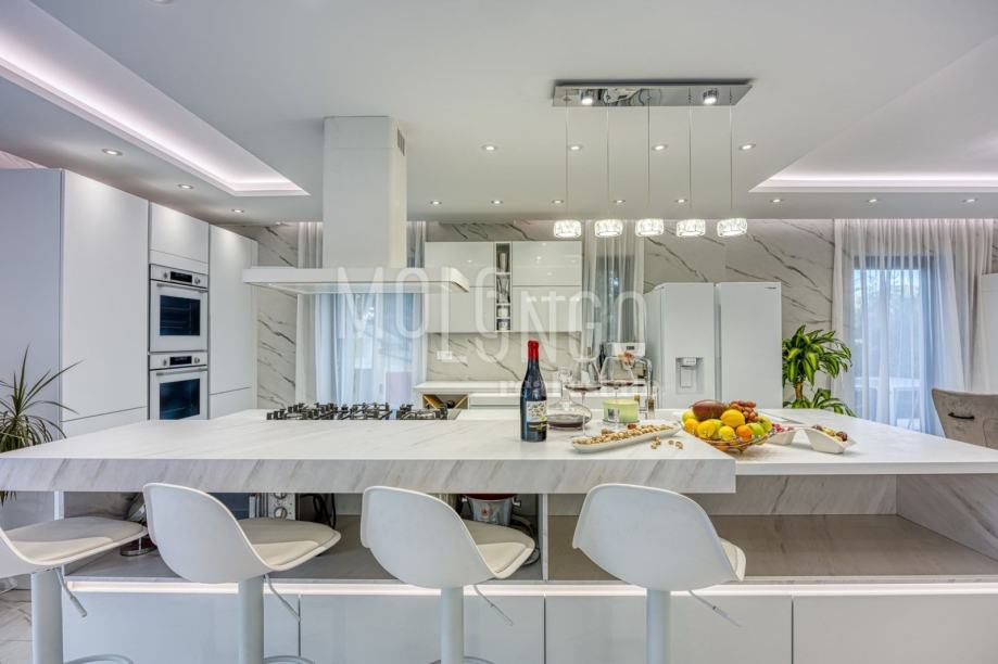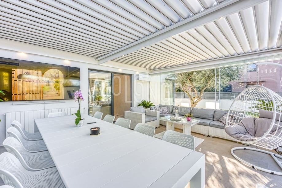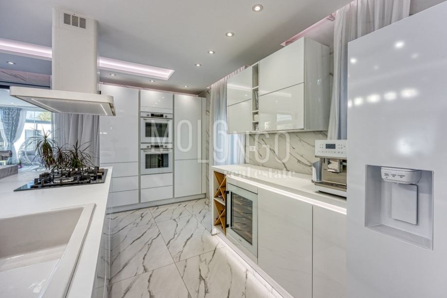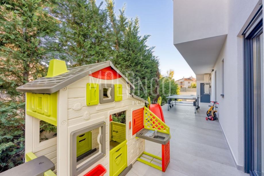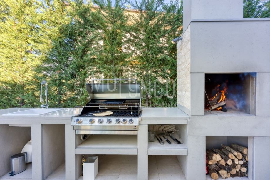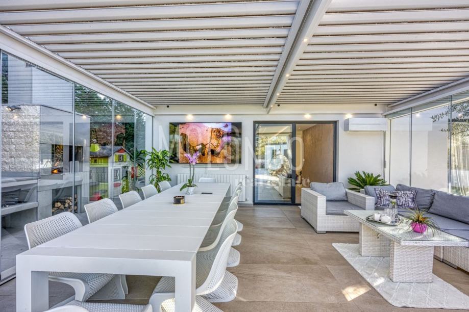 Vanjska natkrivena terasa, pristupačna kroz kuhinju, dodatno obogaćuje prostor. Velike pomične staklene stijene omogućuju spajanje unutarnjeg i vanjskog prostora. Na terasi se nalazi i vanjski roštilj, savršen za zabavu s prijateljima i obitelji.