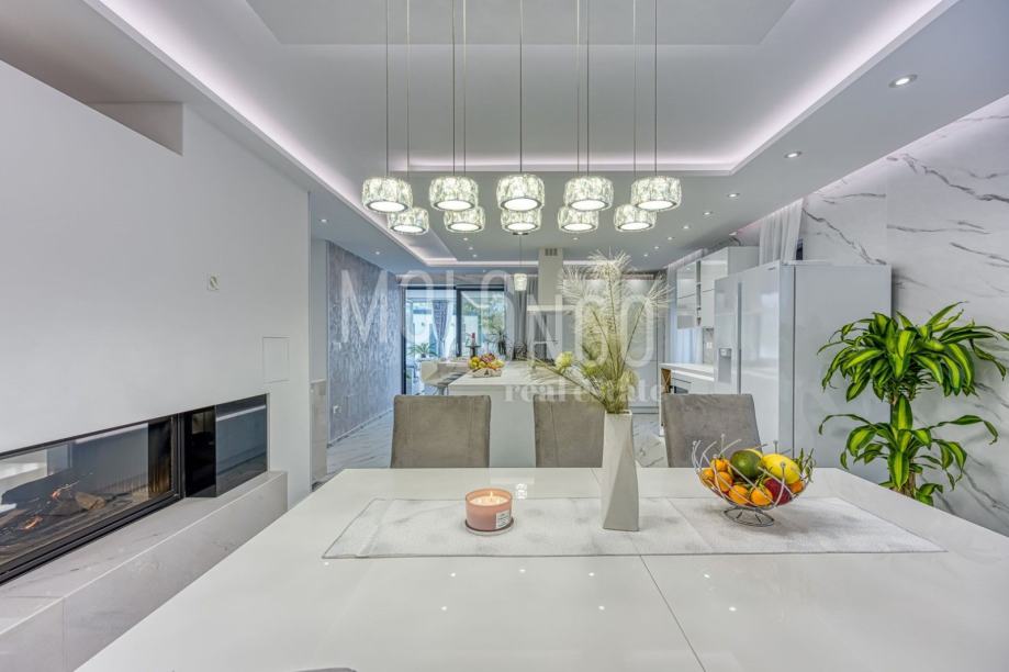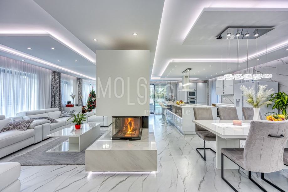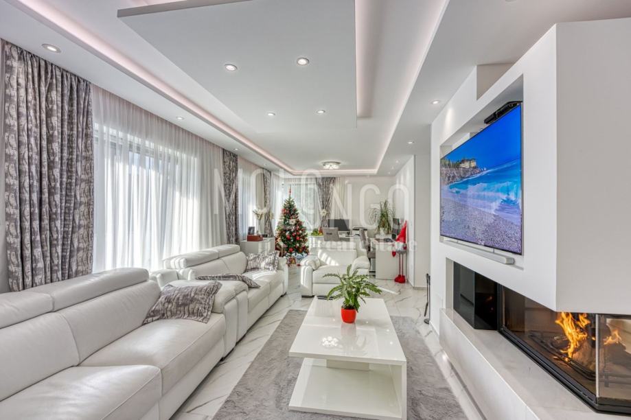 U dnevnom boravku nalazi se moderni poluotvoreni kamin na drva koji pruža poseban ugođaj tijekom boravka u kući. Kvalitetno zagrijavanje prostora osigurava udobnost u svako doba godine.