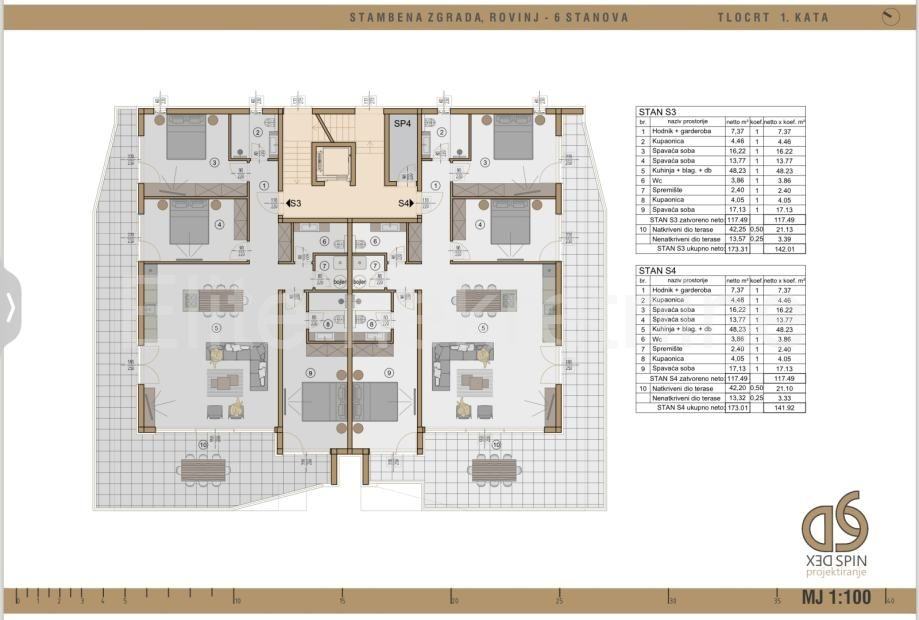 Stan S4 nalazi se na srednjoj etaži (prvi kat) zgrade, sadrži:hodnik s garderobom, kuhinju s blagovaonom i dnevnim boravkom u otvorenom prostoru,tri spavaće sobe, dvije kupaonice, jedan wc, spremište, natkriveni dio terase i nenatkriveni dio terase, sveukupne obračunske kvadrature 141,92 m2.Stanu još pripadaju: spremište te dva parkirna mjesta u garaži s liftom.