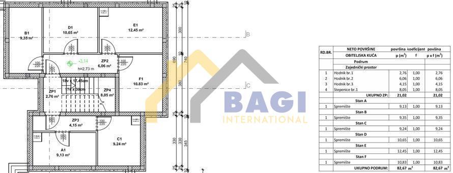 Ukupna stambena površina stana 133,4m2 + podrum 9,24m2 = 142,64m2
